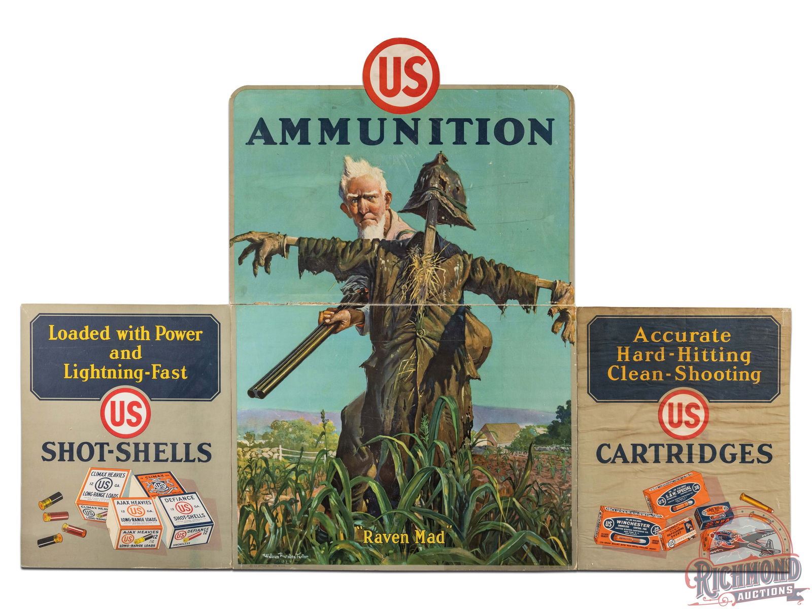 Large cardboard die cut with excellent color and graphics, circa 1930. "Raven Mad" by renowned artist William Harnden Foster (1927) features a farmer hiding behind a scarecrow with various shotgun shell and cartridge boxes on the side panels. Reads "Accurate, Hard-Hitting, Clean-Shooting" on right and "loaded with Power and Lightning-Fast" on left. Exhibits with wear, marks, mild spotting and discoloration. The right panel and right edge of center panel show water damage but is in tact. This piece displays incredibly well. Shrink wrapped and secured to foamboard. Marked US Cartridge Co Litho USA on bottom left and Form CS98 3-30 on bottom right. 40" H x 58" W.