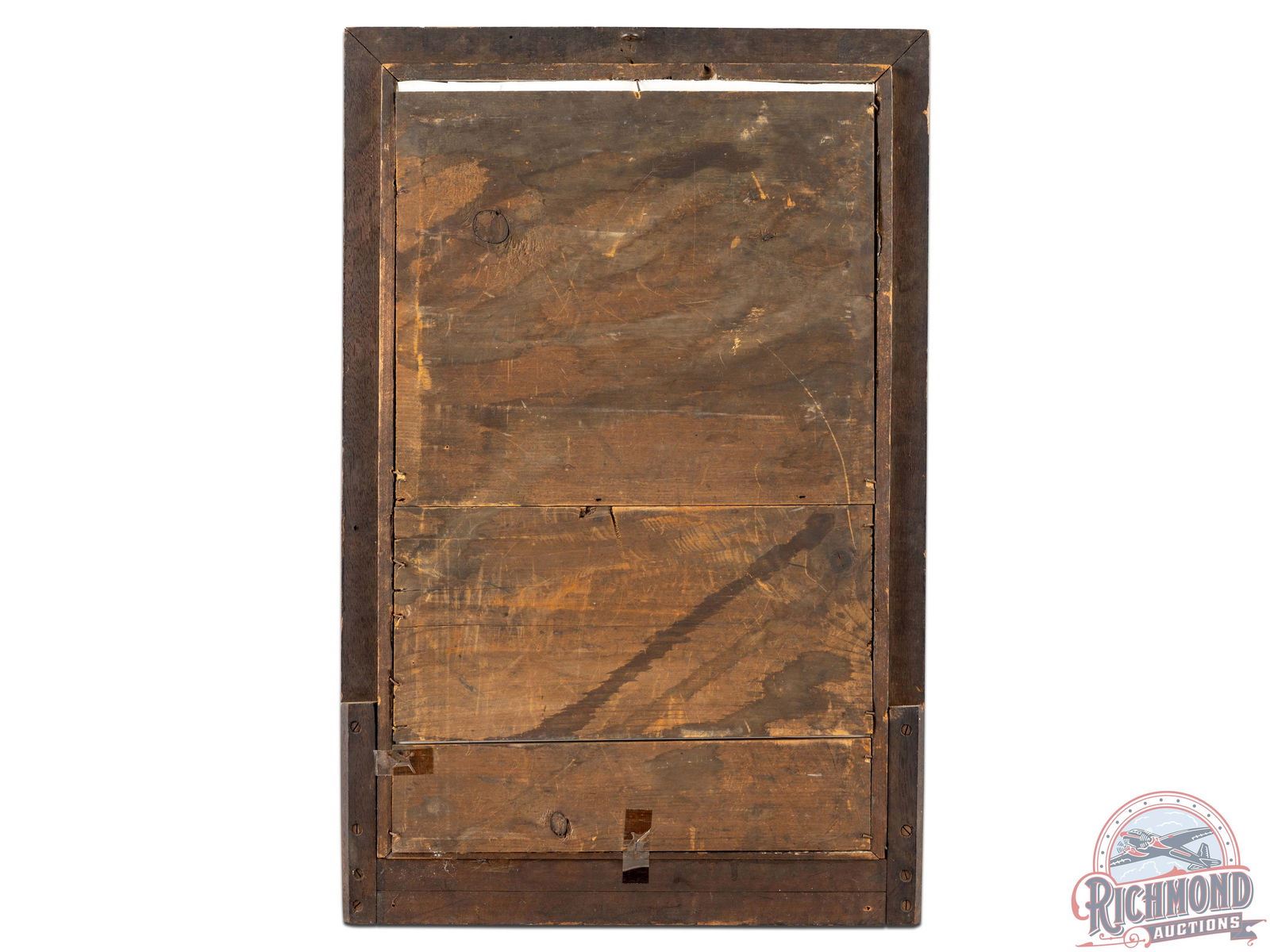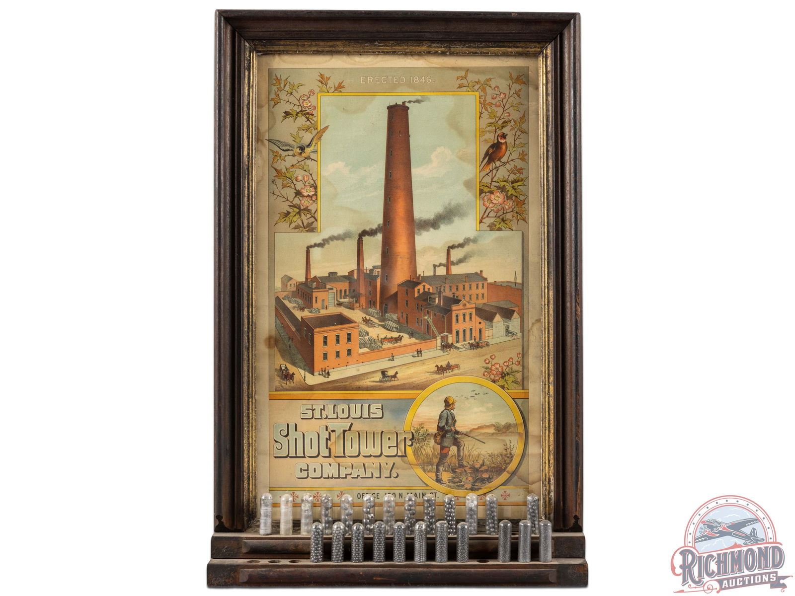 Incredible wooden countertop display featuring a colorful lithograph poster of the St. Louis Shot Tower facility, a hunter with birds in flight and various glass tubes containing lead shot of different sizes. The lead shot was created by dropping molten lead onto screens of different sizes, naturally forming the lead into different sizes via gravity which then fell into a pool of water. Exhibits with typical age and storage wear. Mounted behind glass, the poster has great color with various spots and staining, mostly along the edges. The wooden display shows wear and retains 23 full glass tubes with various sizes of lead shot. Five tubes are missing and one is cracked and empty. This piece will stand out in any sportsman collection and is sure to be a conversation starter. 25.5" H x 16.75" W x 3.25" D.