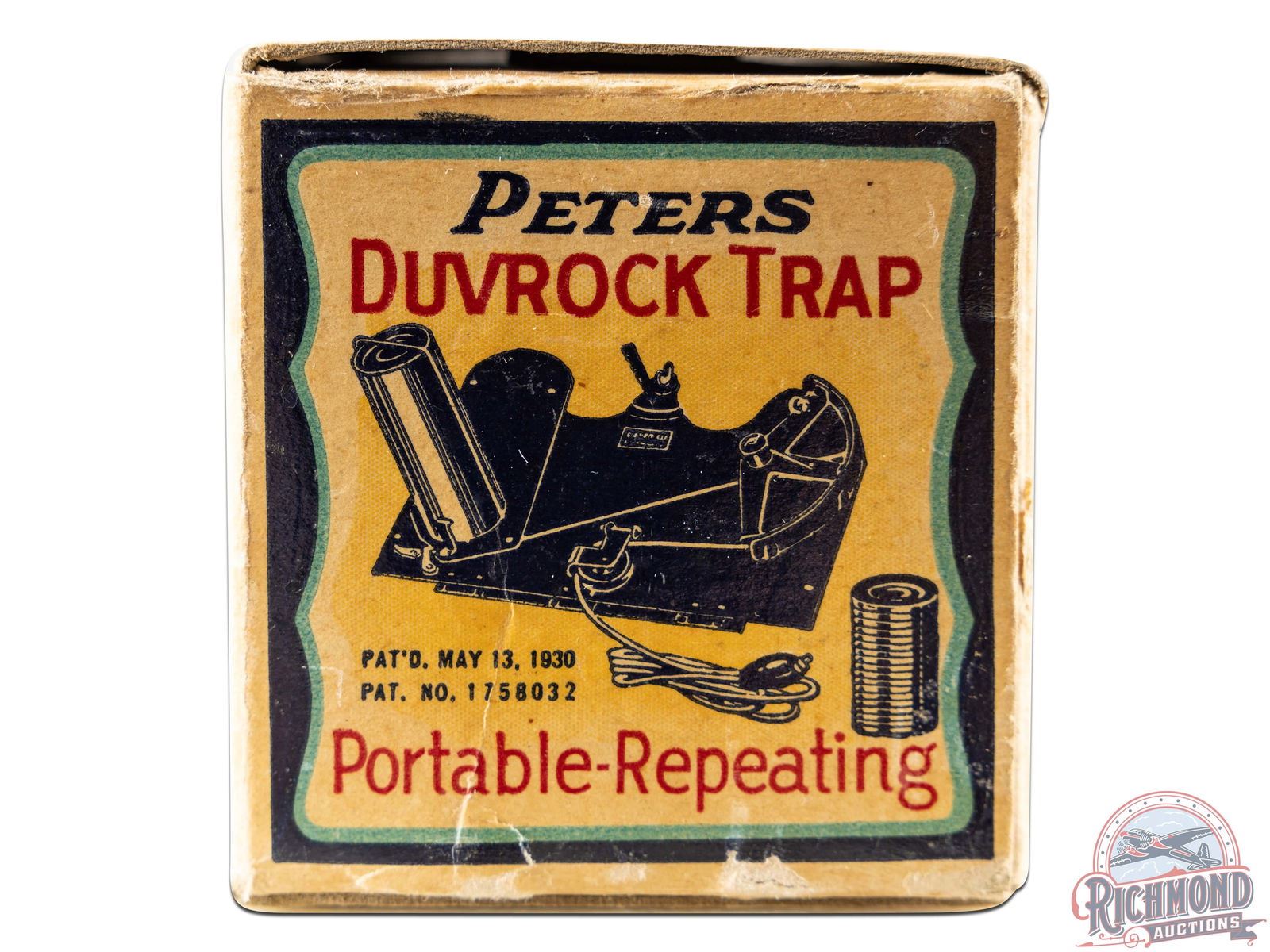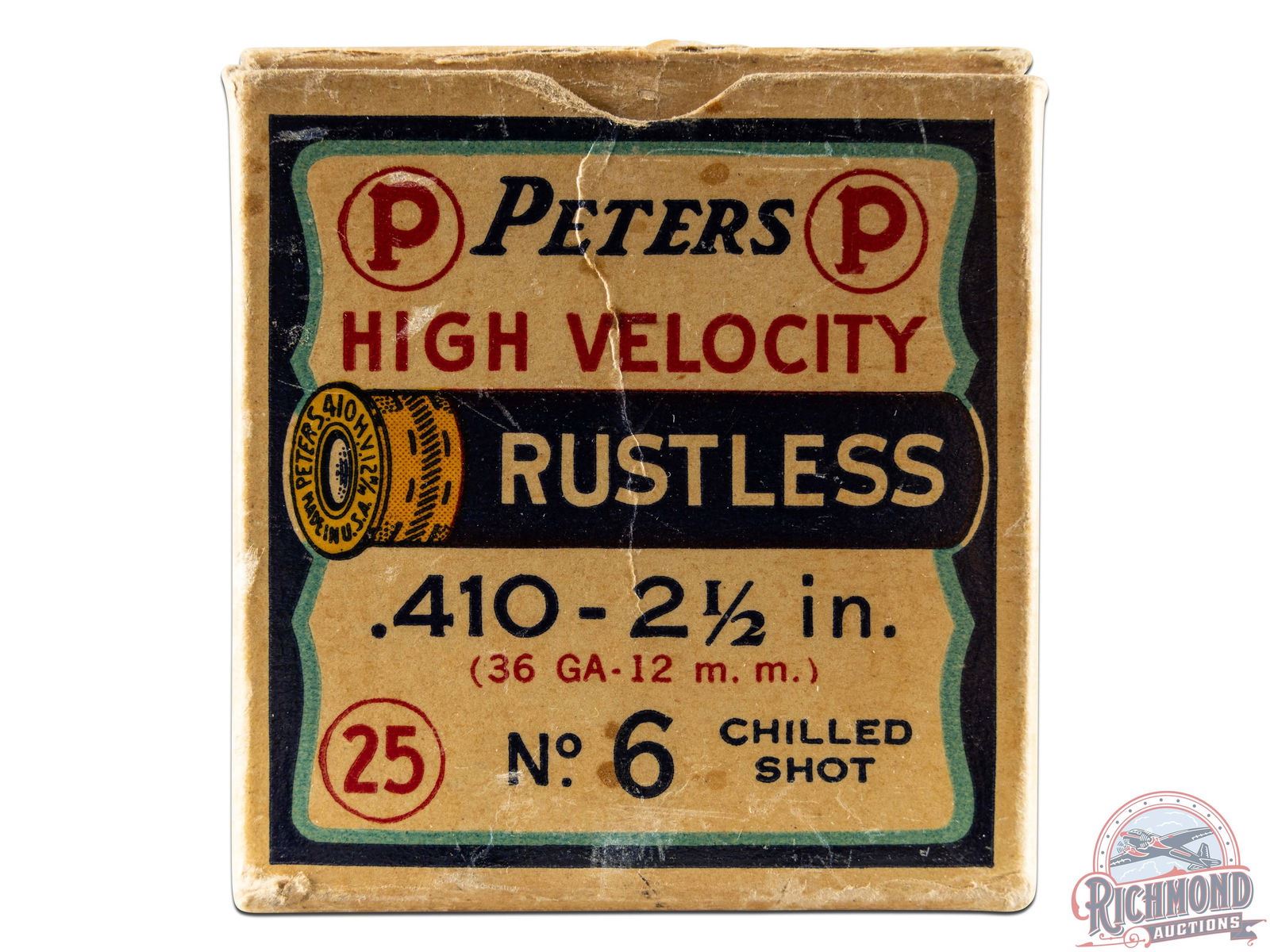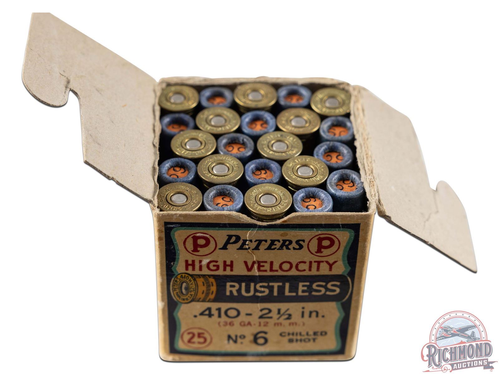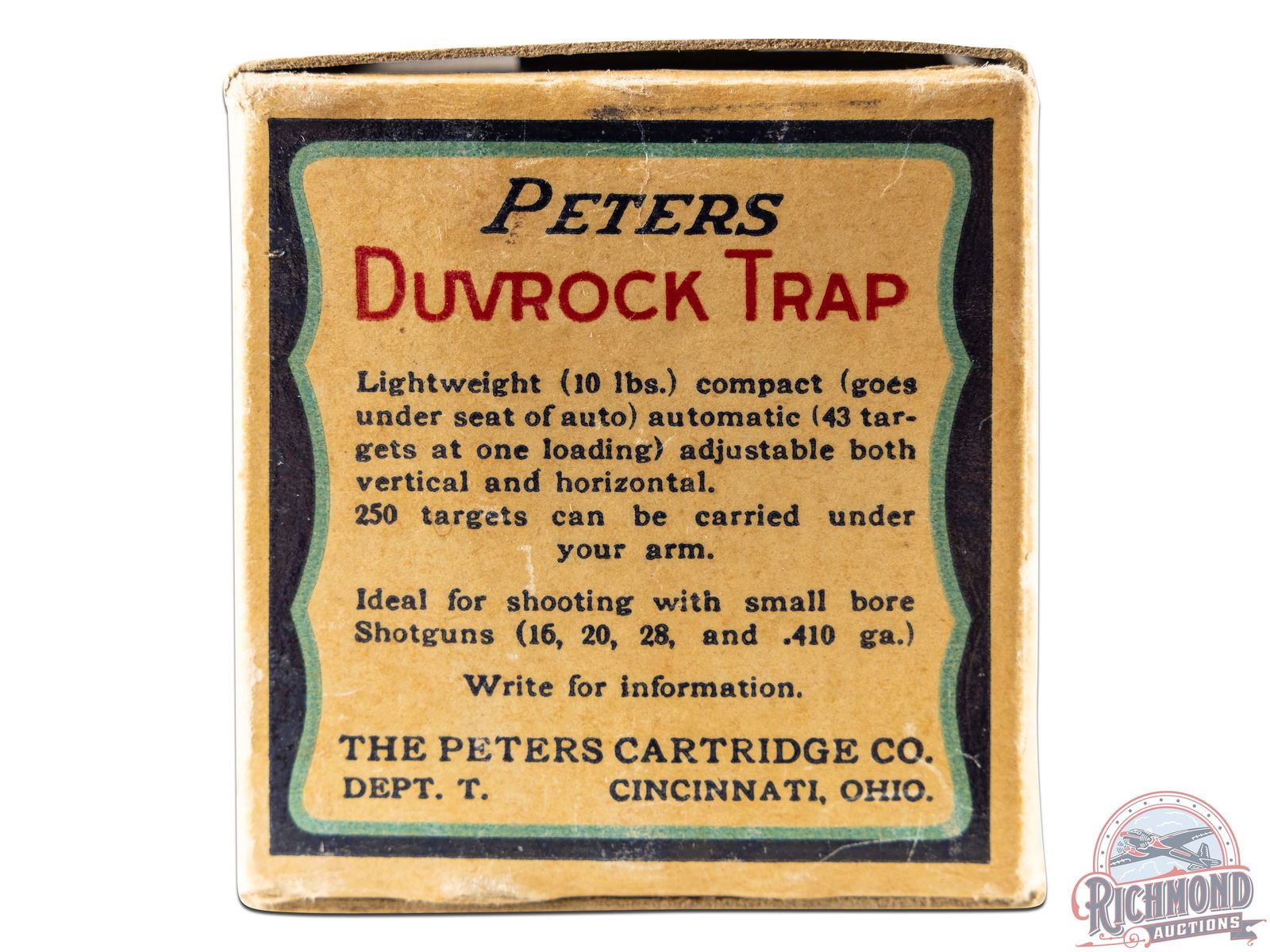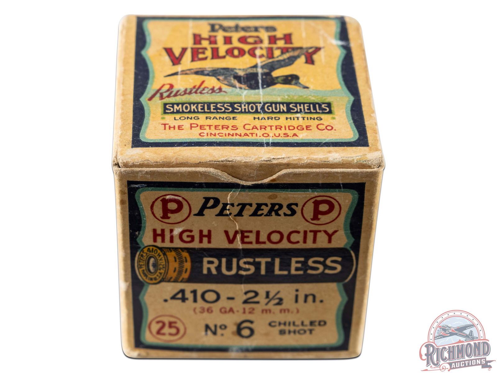 Listed as a "6" rarity in Bacyk's Shotshell Encyclopedia. Box is a 25 round, 410 Caliber, one-piece cardboard "High Velocity" labeled shotshell box with Cincinnati, Ohio Address with "Duvrock Trap" advertisements. Box is full of correct shells loaded with correct "No. 6" shot and "2-1/2" shells.