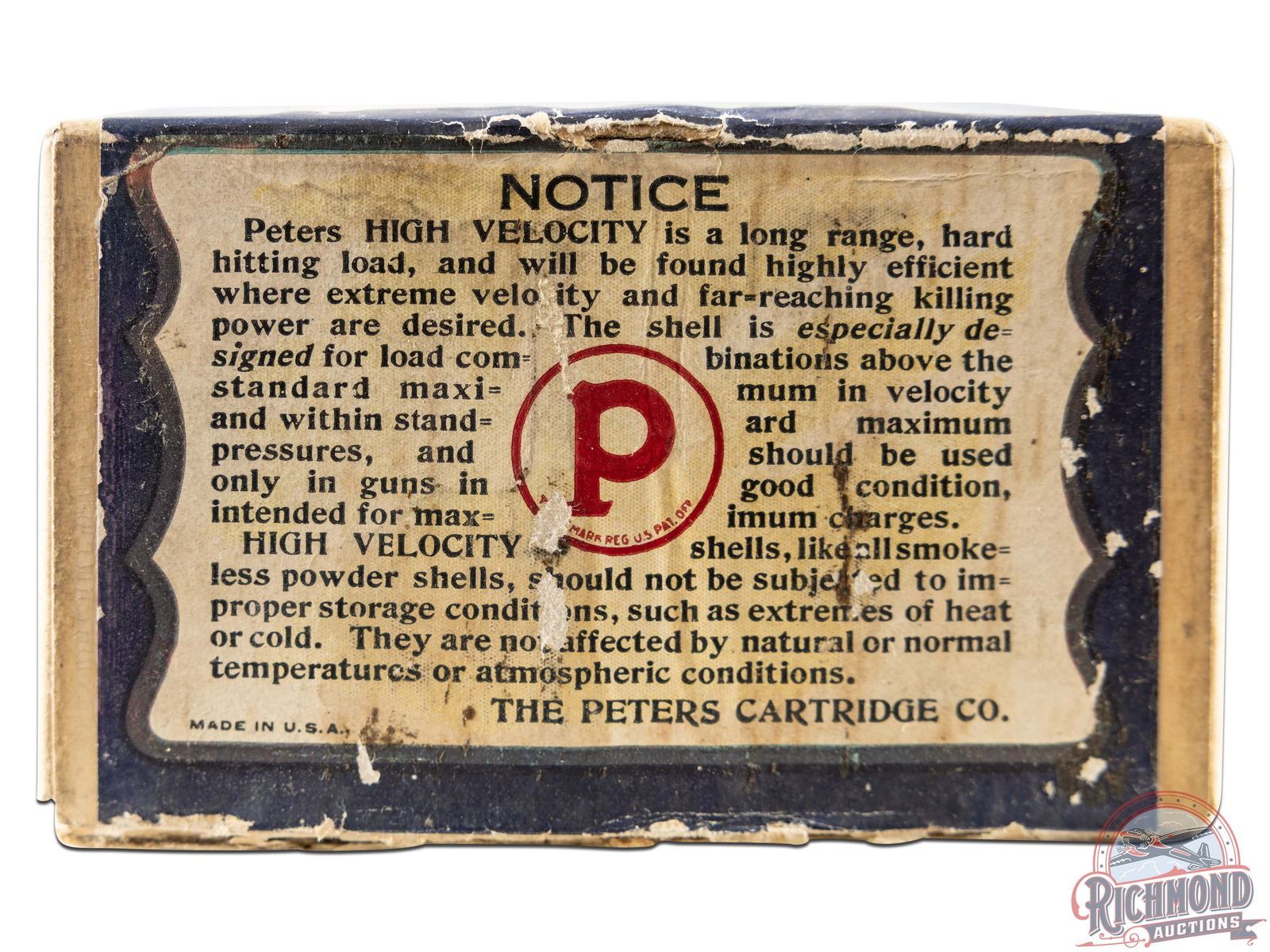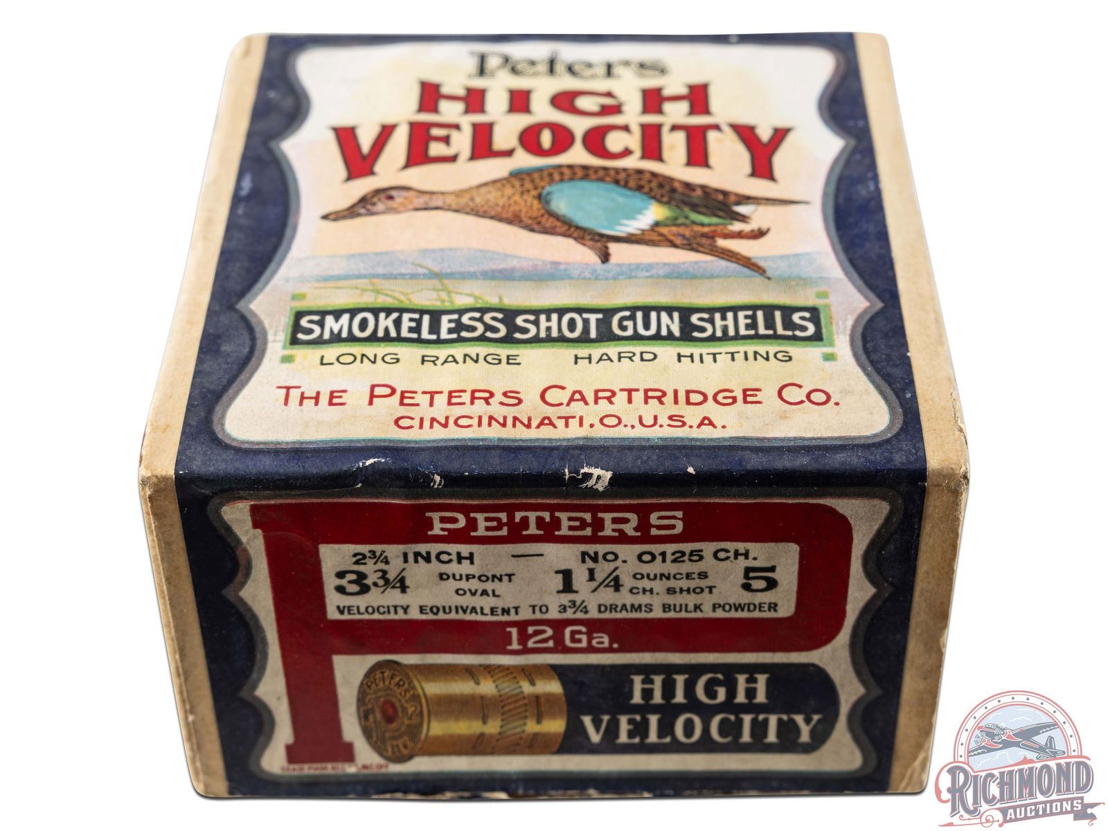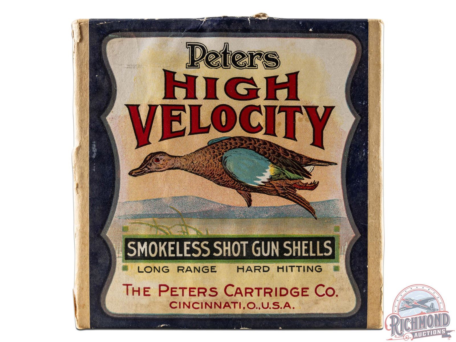 Early Peters Cincinnati, Ohio Address High Velocity" labeled two-piece 12 gauge shotshell box with 20 original shells loaded with "Dupont Oval" and "5" shot matching label. Early "Duck" label with no "Rustless" marking.