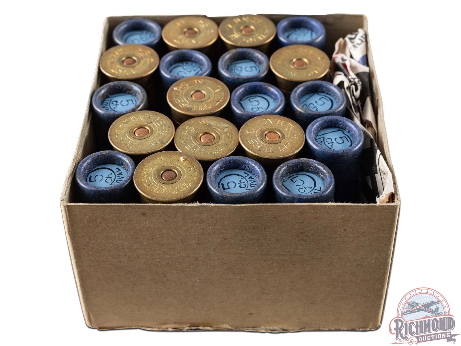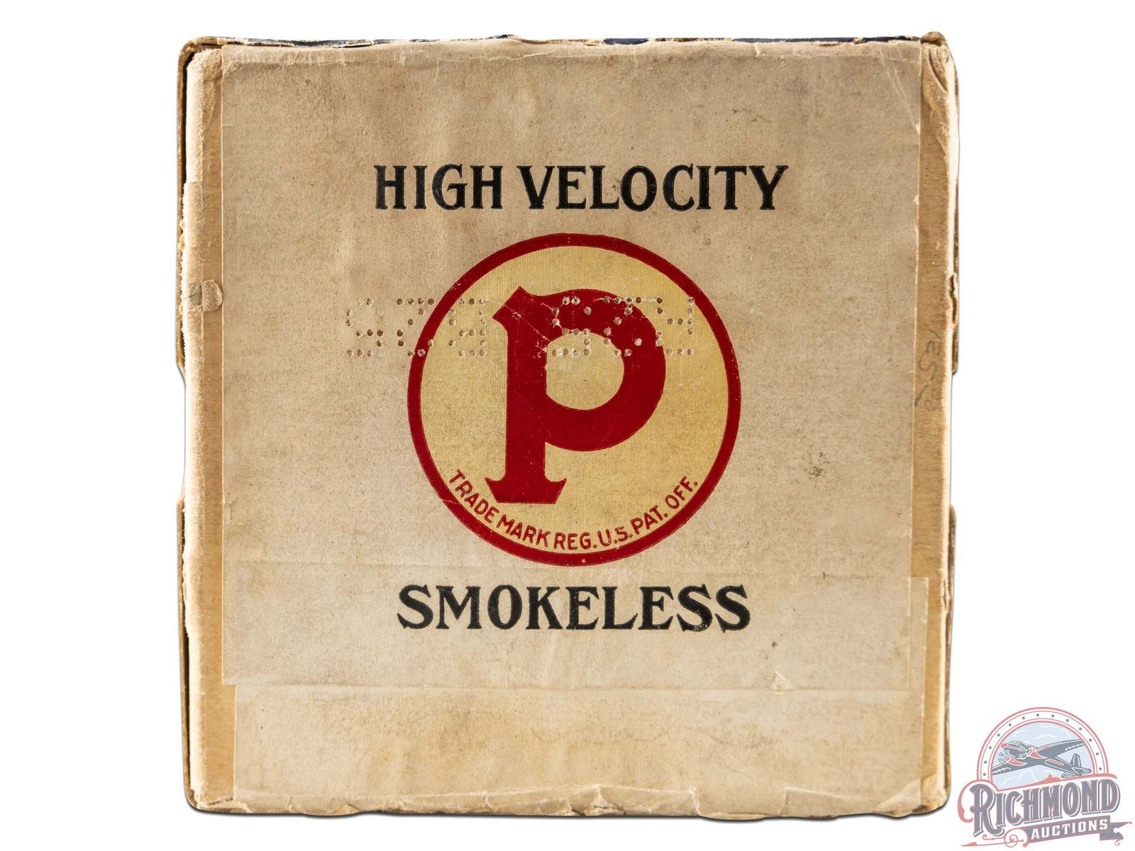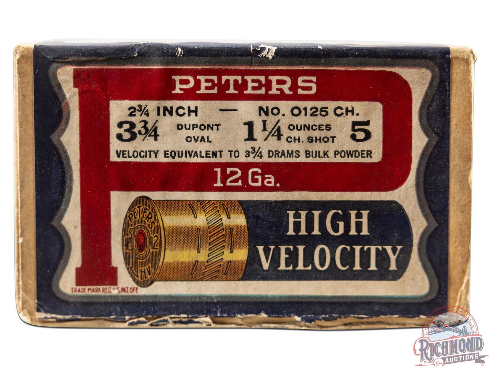 Early Peters Cincinnati, Ohio Address High Velocity" labeled two-piece 12 gauge shotshell box with 20 original shells loaded with "Dupont Oval" and "5" shot matching label. Early "Duck" label with no "Rustless" marking.