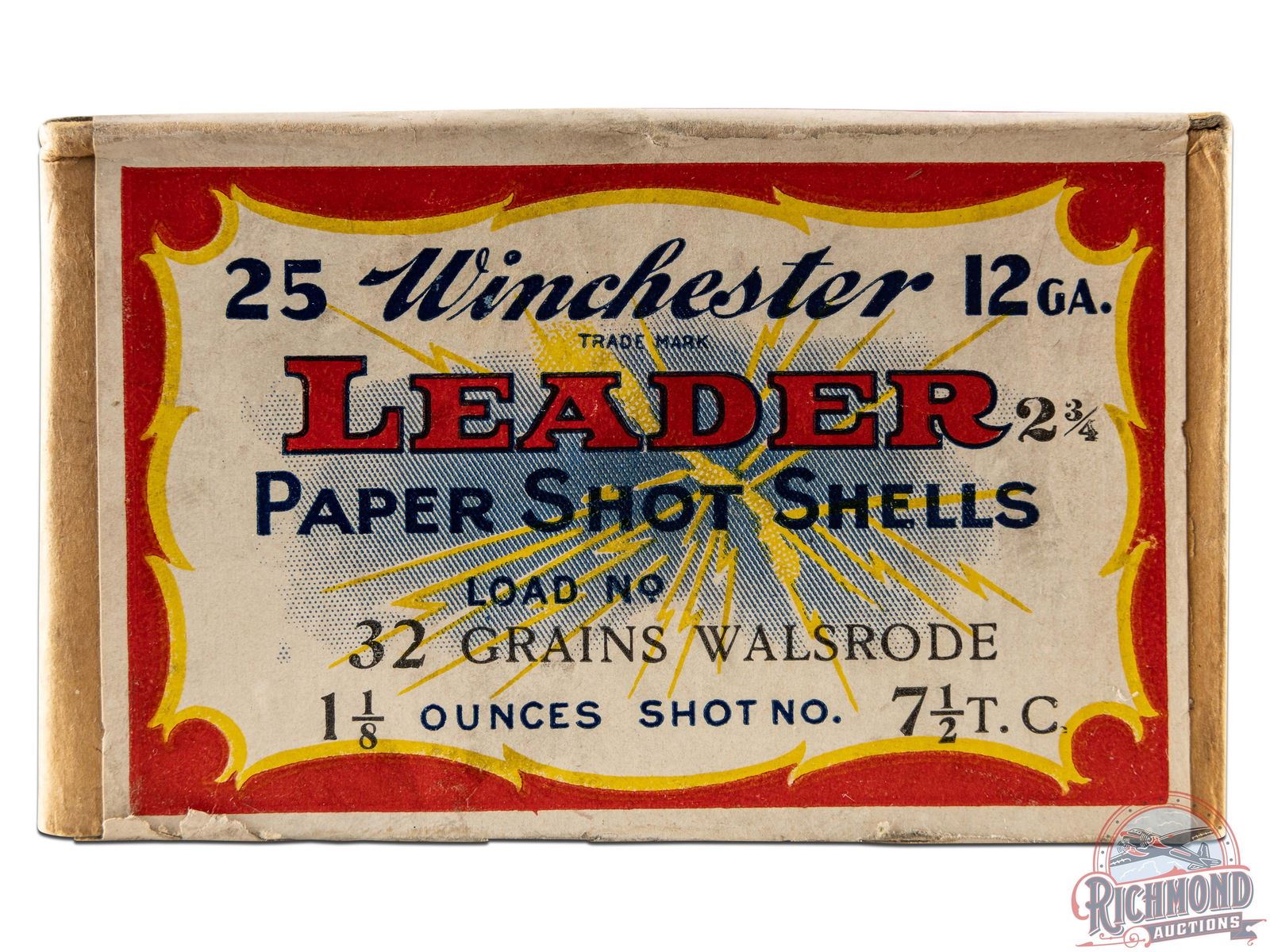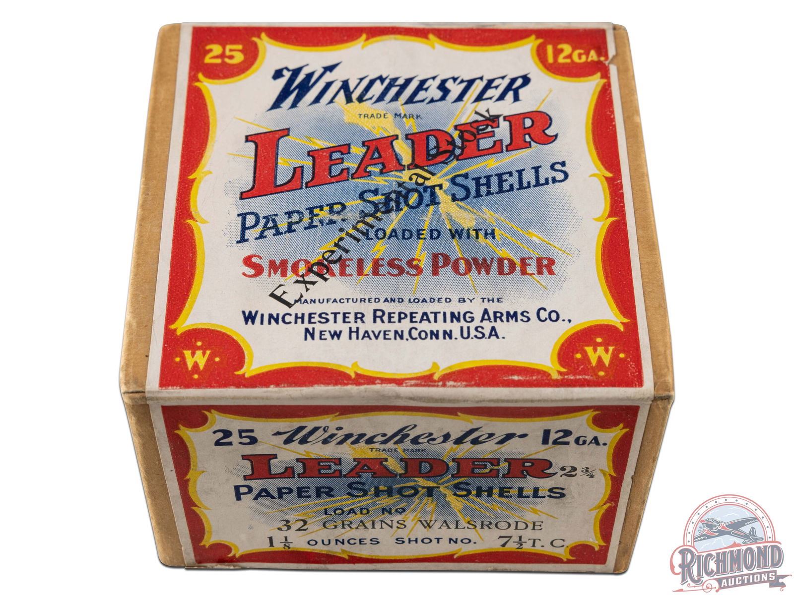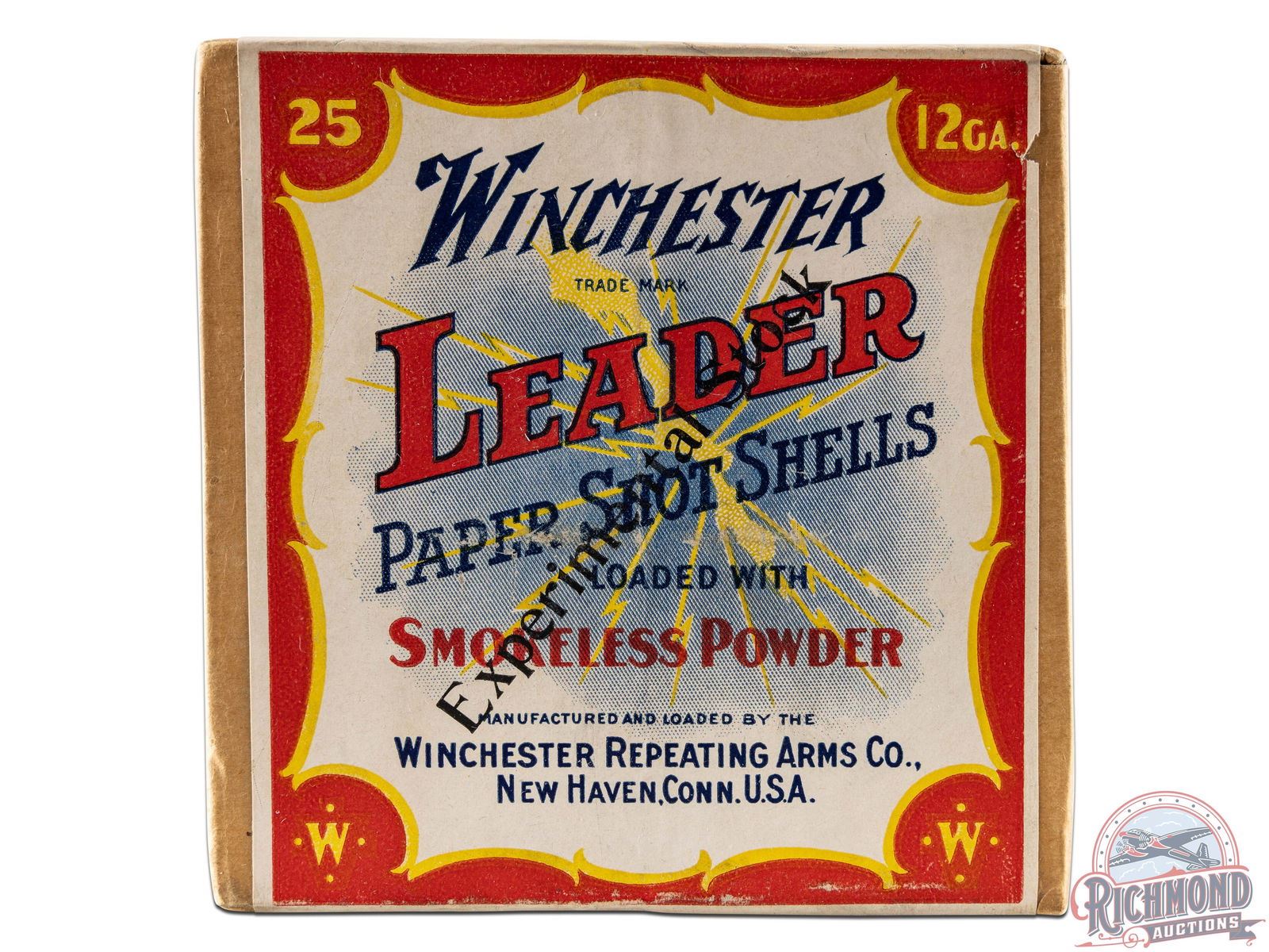 Listed as a "6" rarity in Bacyk's Shotshell Encyclopedia. Box is a 25 round, 12 gauge, two-piece cardboard Winchester "Leader" labeled box with "Experimental Stock" stamped diagonally with original shells loaded with "Walrode" Powder and "7 1/2 T.C." shot.