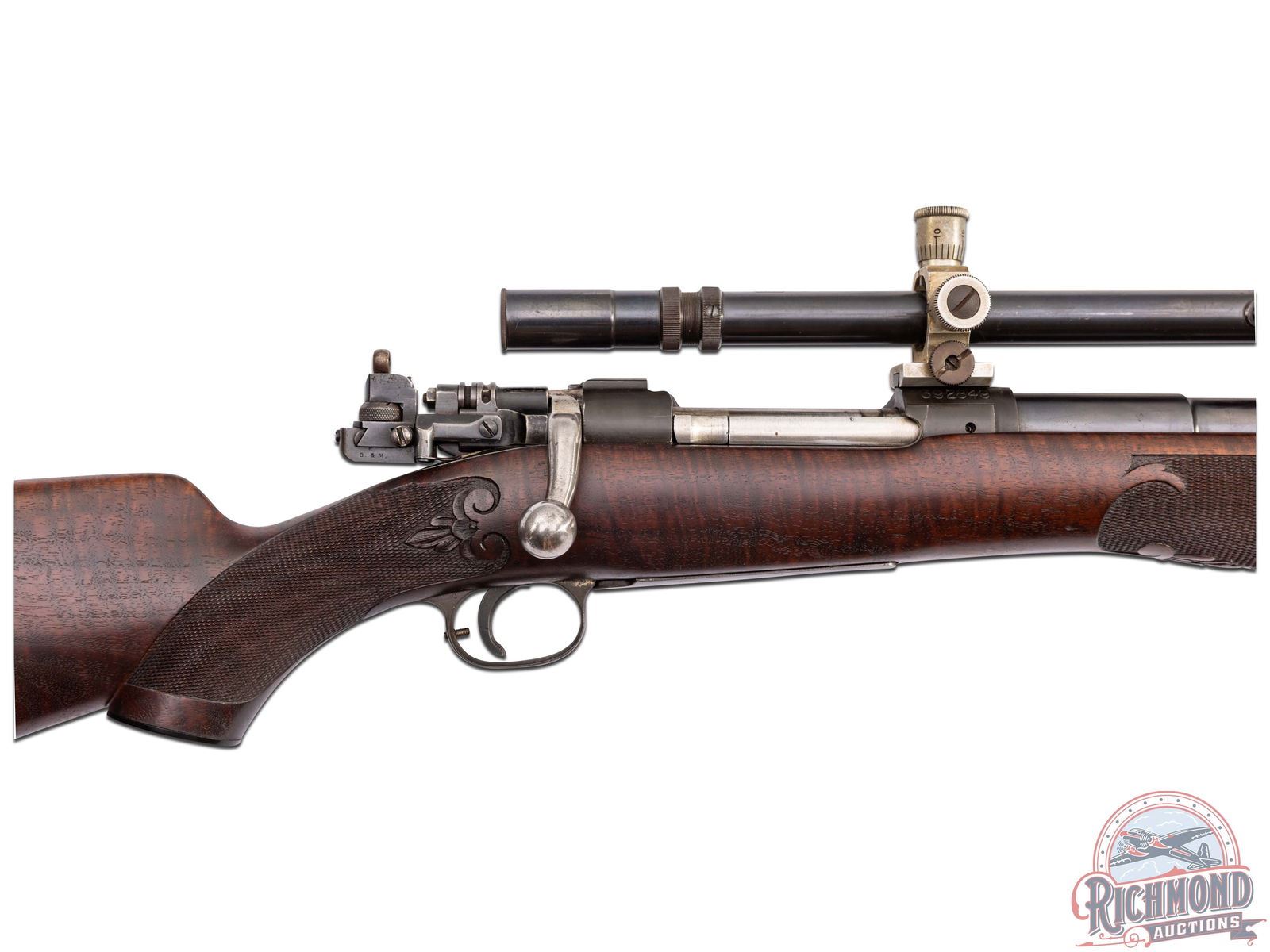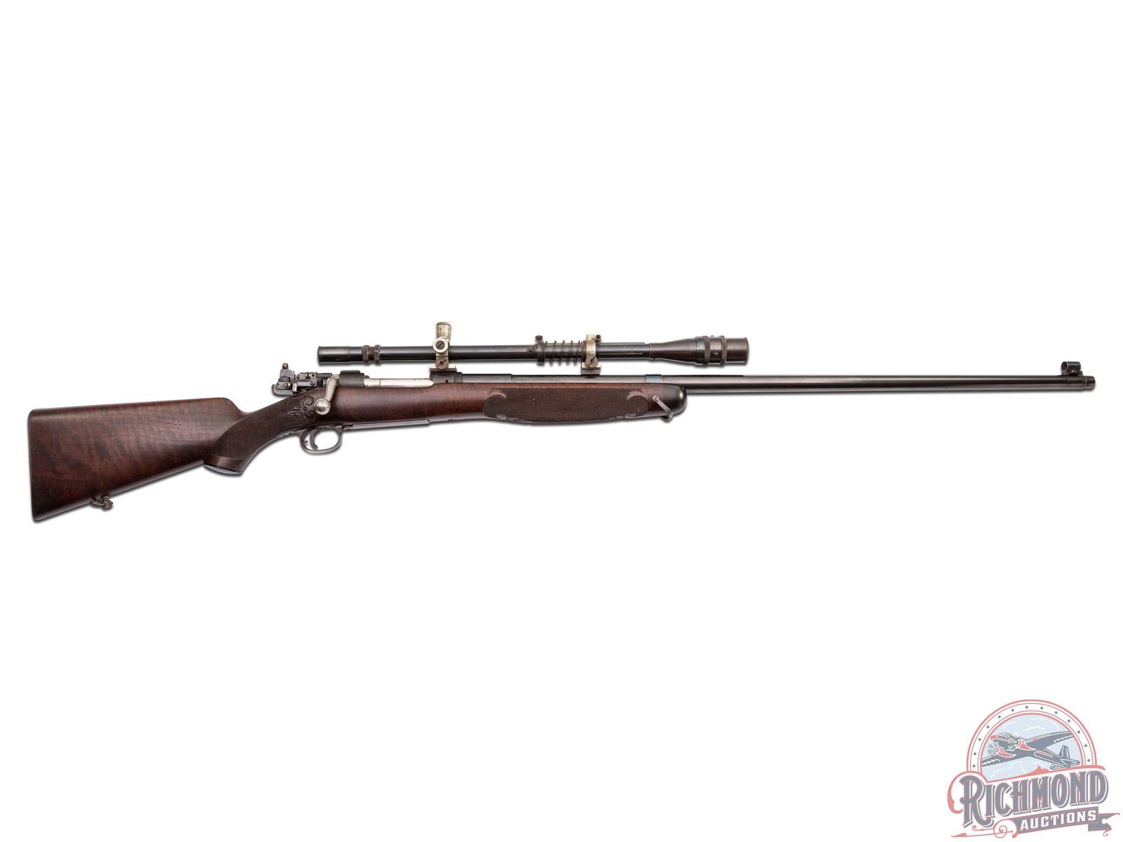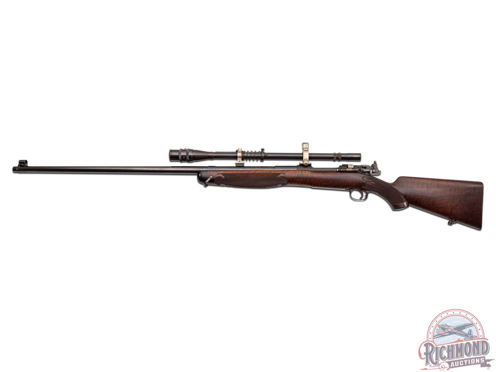Made by Springfield Armory, Springfield, Massachusetts, in 1909, with the barrel being fitted by H.M. Pope in 1924. This rifle is known as the "1924 International Match Target Rifle". This rifle is one of approximately fifty known rifles, with Pope rarity factor unknown. Rifle has 32" tapered 30 caliber barrel with Globe front sight and Belding and Mull bolt peep sight. Barrel is stamped "H.M. Pope" and has "607" Pope number under the stock and is fitted with Posa mounts and an Unertl 8x target scope with caps. Standard 1903 action with three position safety, single trigger and blued 1903 steel floorplate. Bolt is polished with "L" marking on underside. Custom walnut checkered pistol grip stock with Perch-belly forearm and carved Fleur-De-Lis design with ebony forearm cap and steel decorated shotgun butt plate. Consignor lore reports that this rifle was made for Colonel Townsend Whelan and stocked by Griffin and Howe. More research is needed to verify these issues. J.T. Livengood Collection. CALIBER: 30-06. S/N: 392849. FFL STATUS: Curio & Relic.