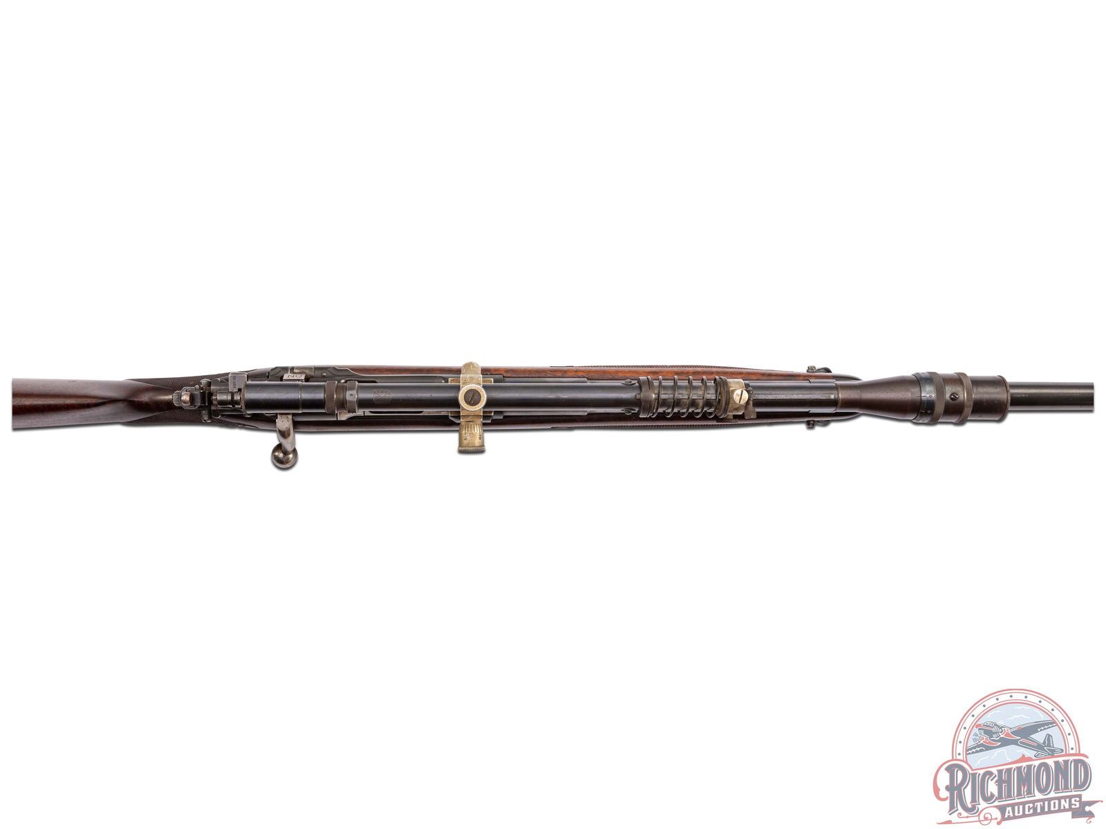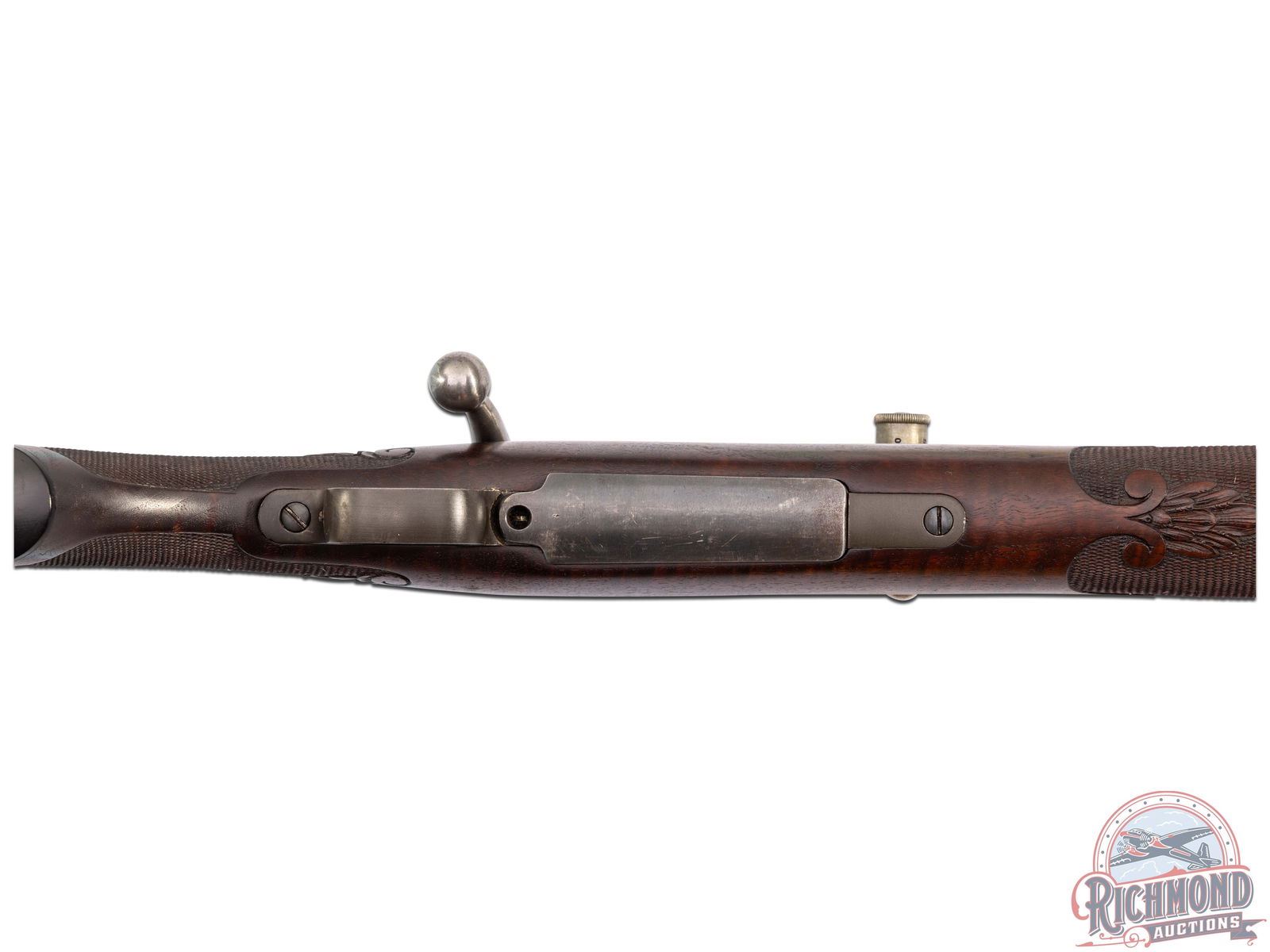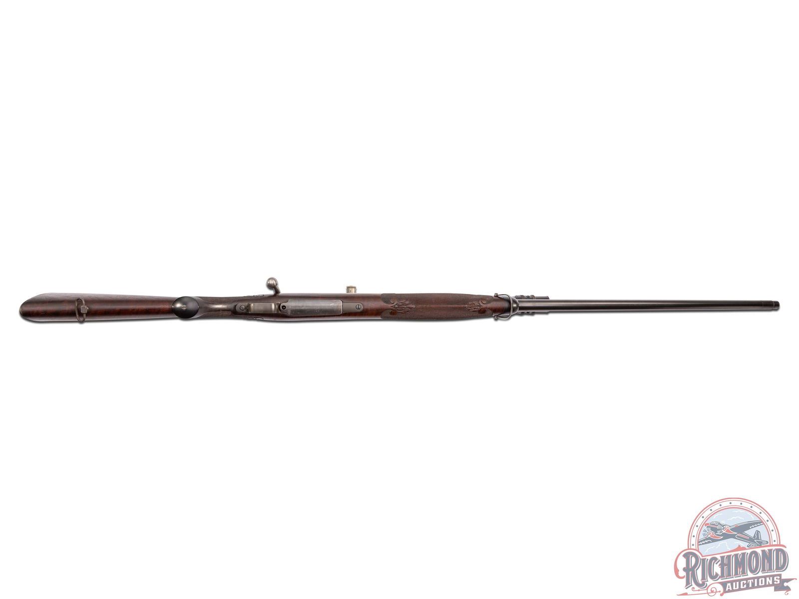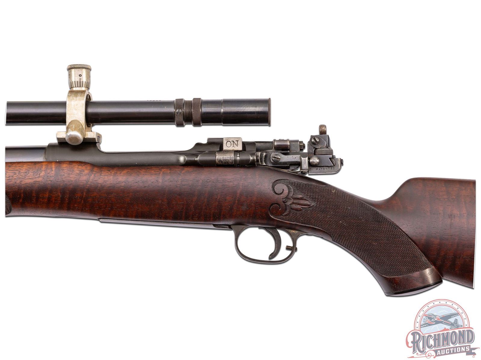 Made by Springfield Armory, Springfield, Massachusetts, in 1909, with the barrel being fitted by H.M. Pope in 1924. This rifle is known as the "1924 International Match Target Rifle". This rifle is one of approximately fifty known rifles, with Pope rarity factor unknown. Rifle has 32" tapered 30 caliber barrel with Globe front sight and Belding and Mull bolt peep sight. Barrel is stamped "H.M. Pope" and has "607" Pope number under the stock and is fitted with Posa mounts and an Unertl 8x target scope with caps. Standard 1903 action with three position safety, single trigger and blued 1903 steel floorplate. Bolt is polished with "L" marking on underside. Custom walnut checkered pistol grip stock with Perch-belly forearm and carved Fleur-De-Lis design with ebony forearm cap and steel decorated shotgun butt plate. Consignor lore reports that this rifle was made for Colonel Townsend Whelan and stocked by Griffin and Howe. More research is needed to verify these issues. J.T. Livengood Collection. CALIBER: 30-06. S/N: 392849. FFL STATUS: Curio & Relic.