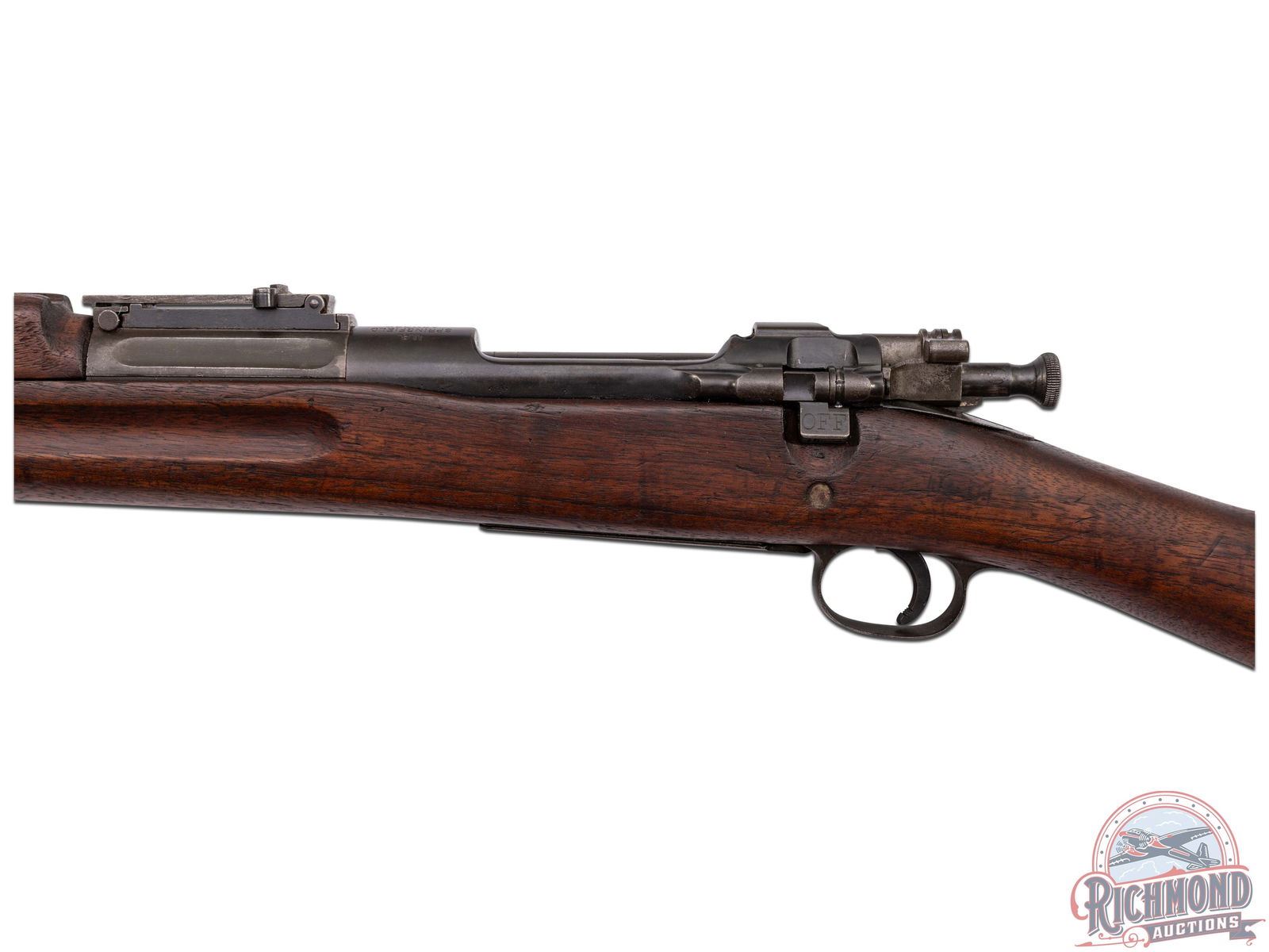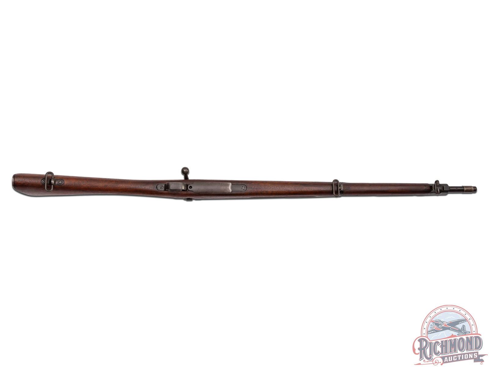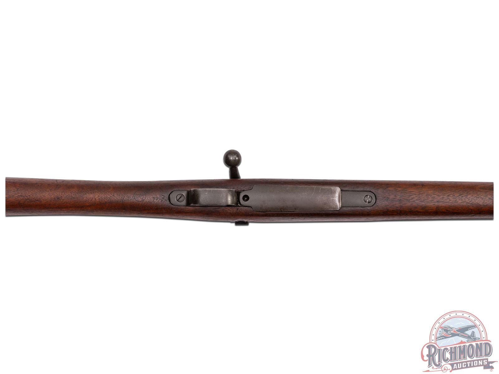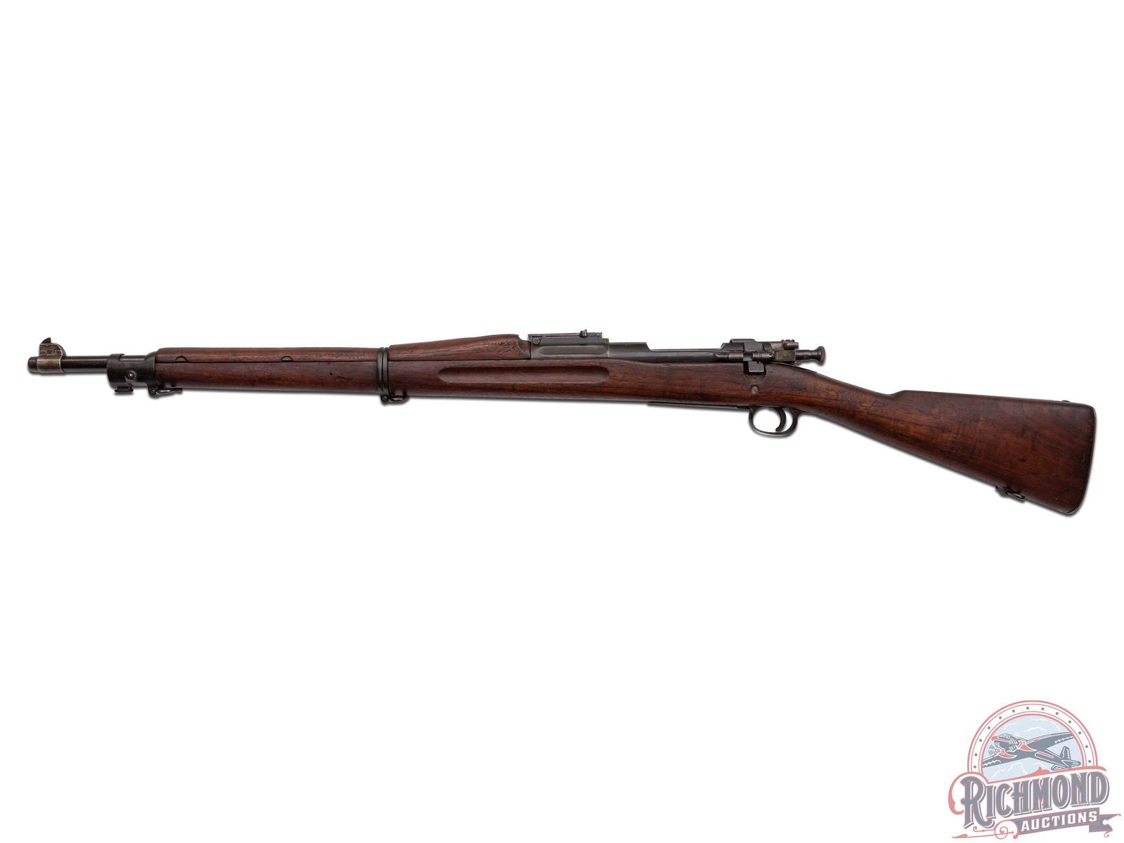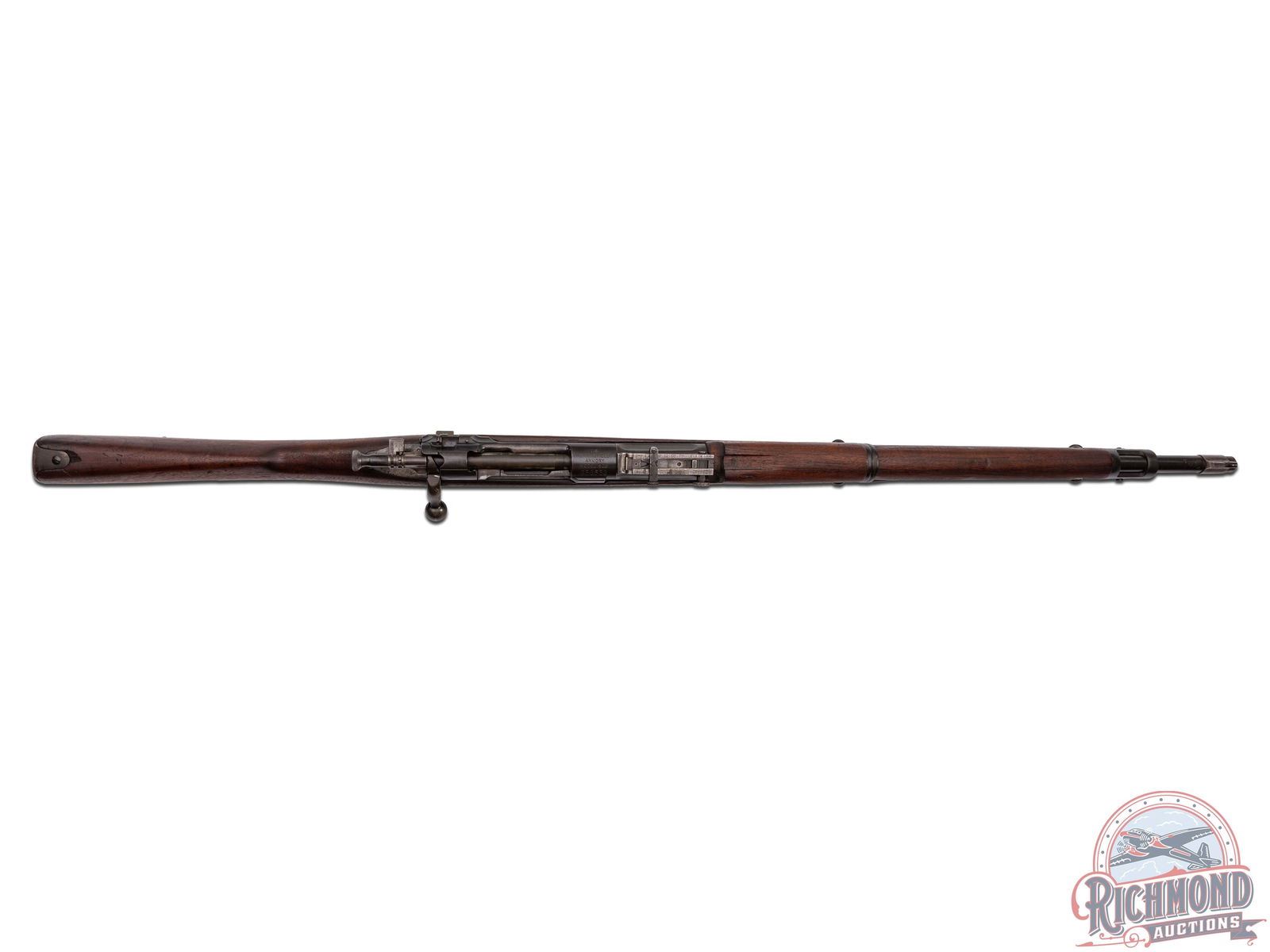 Made at Springfield Arsenal in 1917. 24" blued round military barrel in 30-06 caliber marked "SA/Flaming Bomb/5-16" stamping. Correct banded blade front sight and rear flip sight graduated to 2800 yards. Blued action with Springfield marked receiver. Correct marked straight handle bolt with later Parkerized finish. Walnut finger groove "S" stock with illegible cartouche and "P" in circle proof. Blued milled floorplate with blued hardware. Matching walnut humped top wood. Comes with nickel plated oil bottle in trap butt. CALIBER: 30-06. S/N: 636532. FFL STATUS: Curio & Relic.