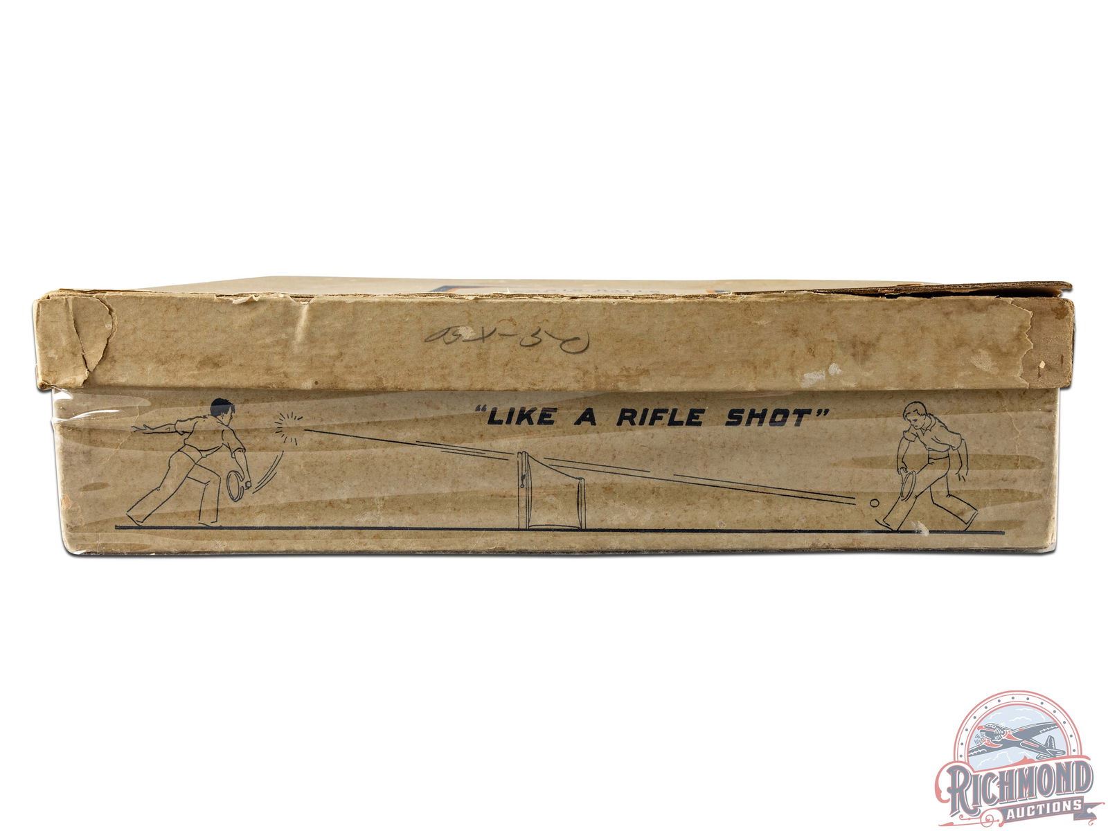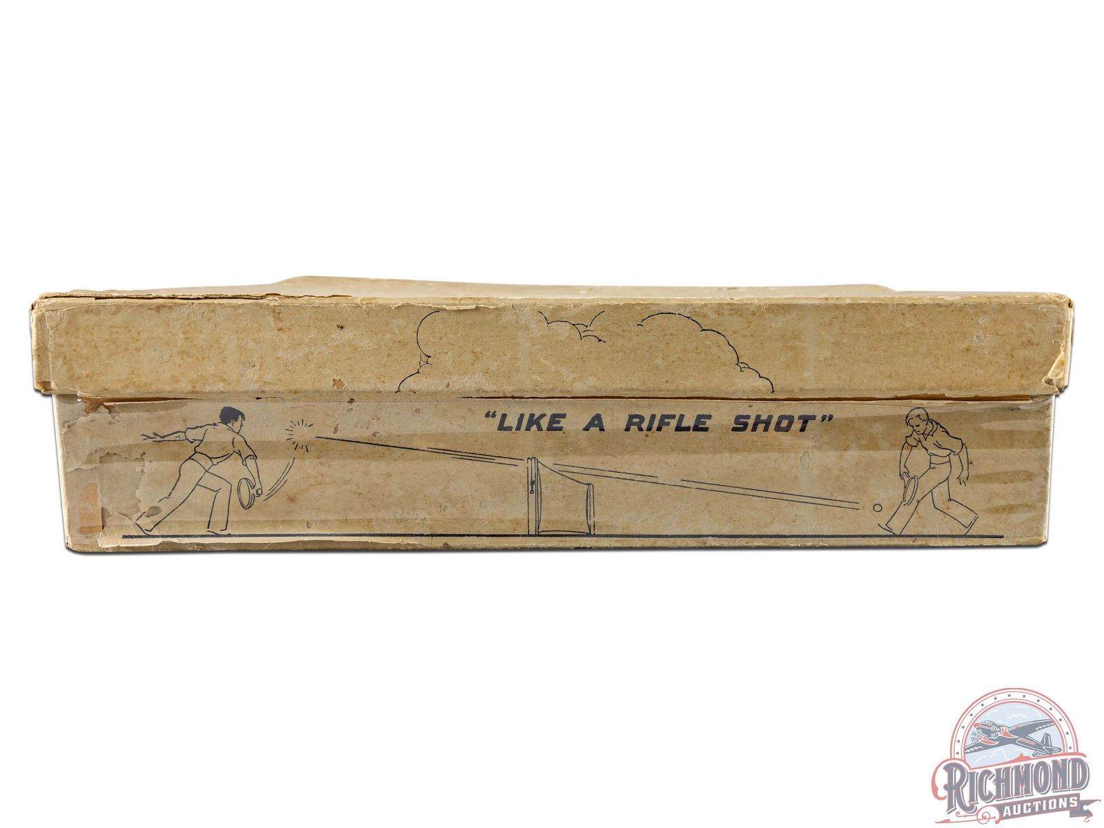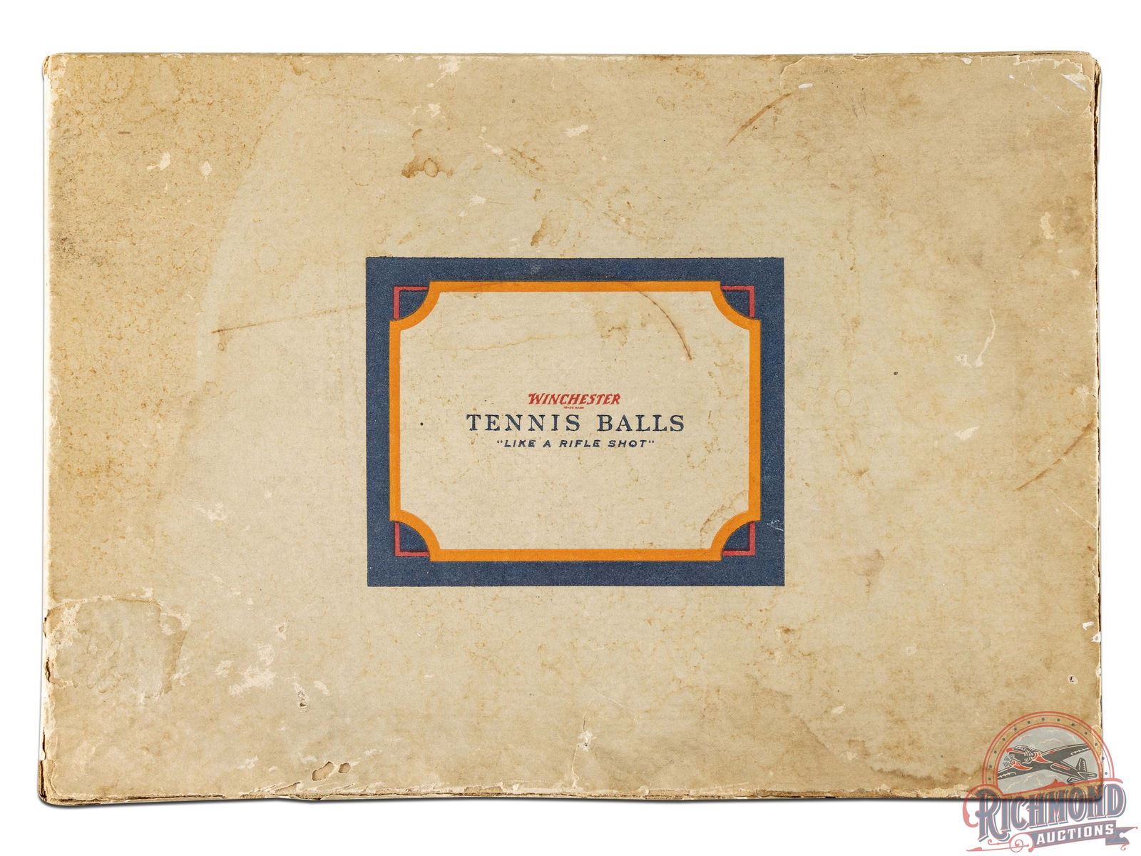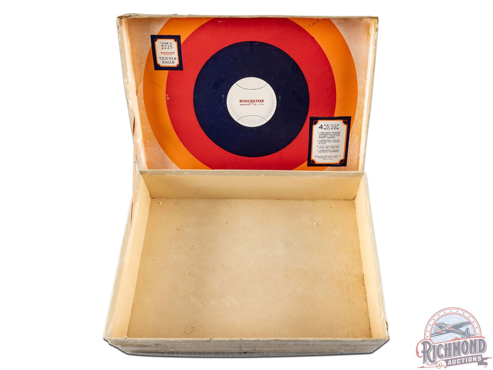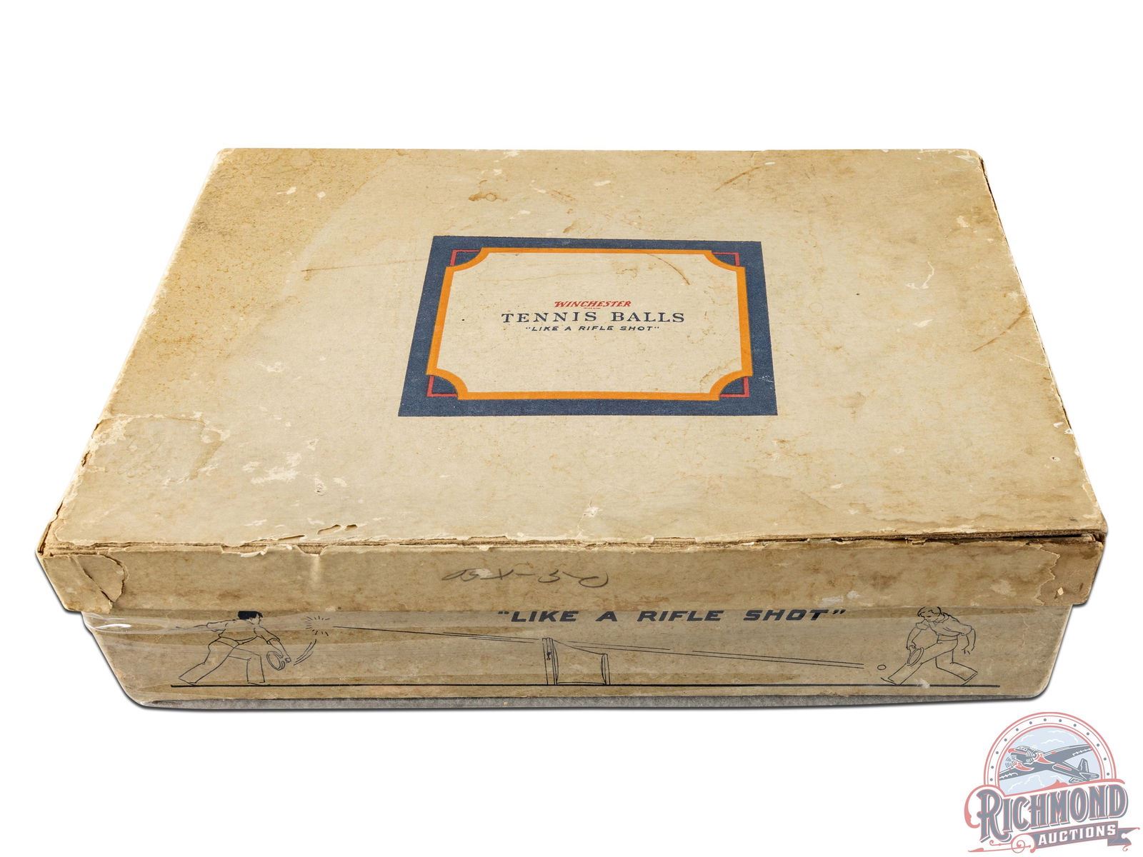 Extremely rare and original Winchester cardboard box for the W1 model tennis ball. One of the only known examples. Originally contained four cans of three tennis balls. Both printed ends are fully visible with model number and Winchester company information. Sides display with a graphic of two people laying tennis and slogan "Like A Rifle Shot." The box is a true survivor with great eye appeal. Overall, the box exhibits general age and storage wear including discoloration, cracking and small areas of loss. The label on one side has started to peel along the bottom but is intact. The top lid has some separation at one corner but remains intact as a whole. The attached lid folds out to display a exceptional concentric circle target on the inside and retains the original cloth stirps that connects the box and lid. Inner lid has exceptional color and all of its inner text is fully legible. 3" H x 8.25" W x 11.5" D.