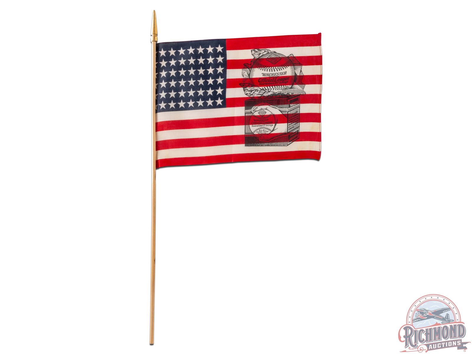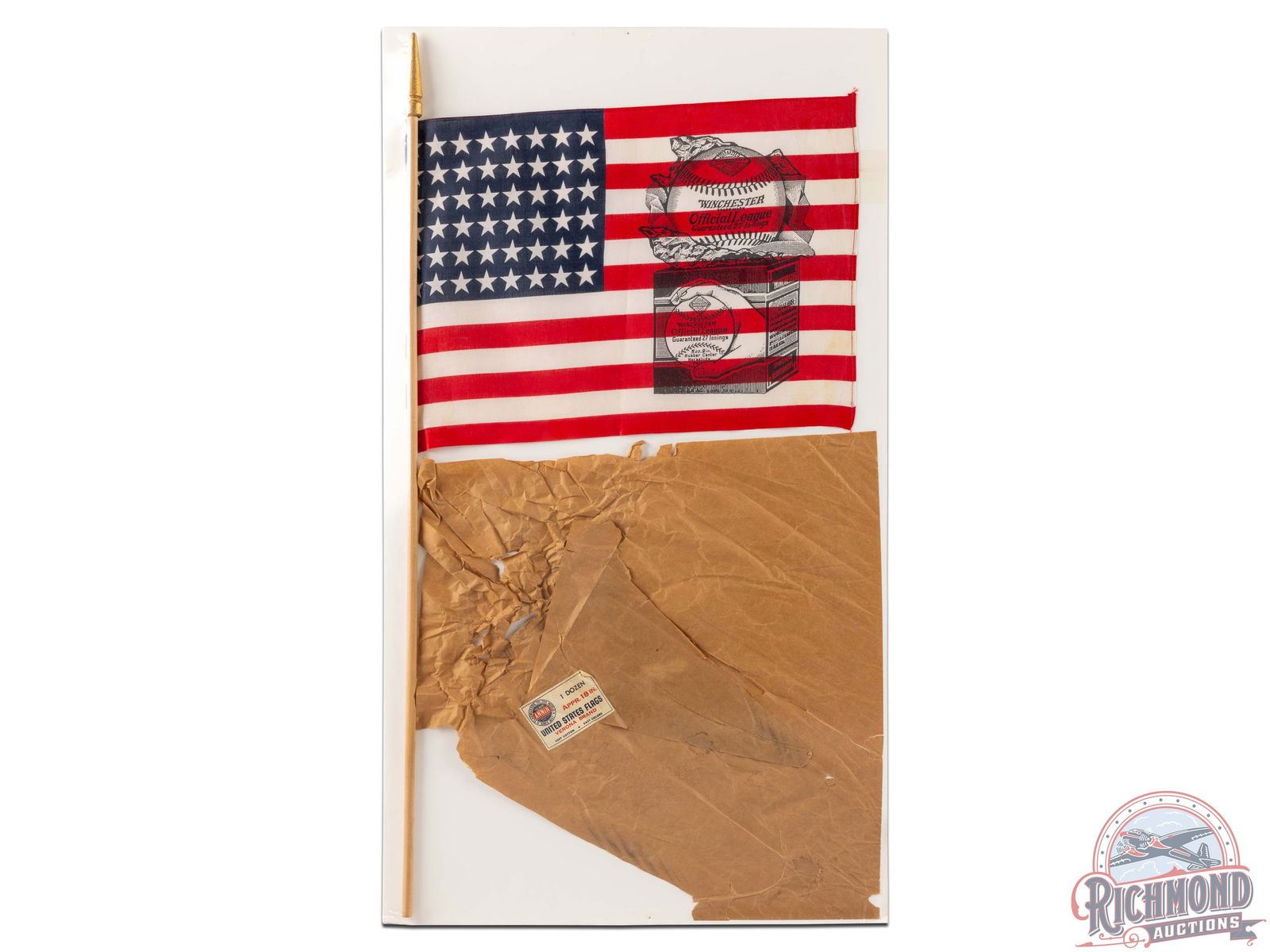 New old stock Winchester American flag with printed graphic of an Official League Winchester baseball. Includes partial paper wrapping and decorative flag pole. Cotton flag has excellent color with areas of oxidation, mainly at the bottom right corner. Baseball graphic is sharp. 11.75" H x 16.5" W.
