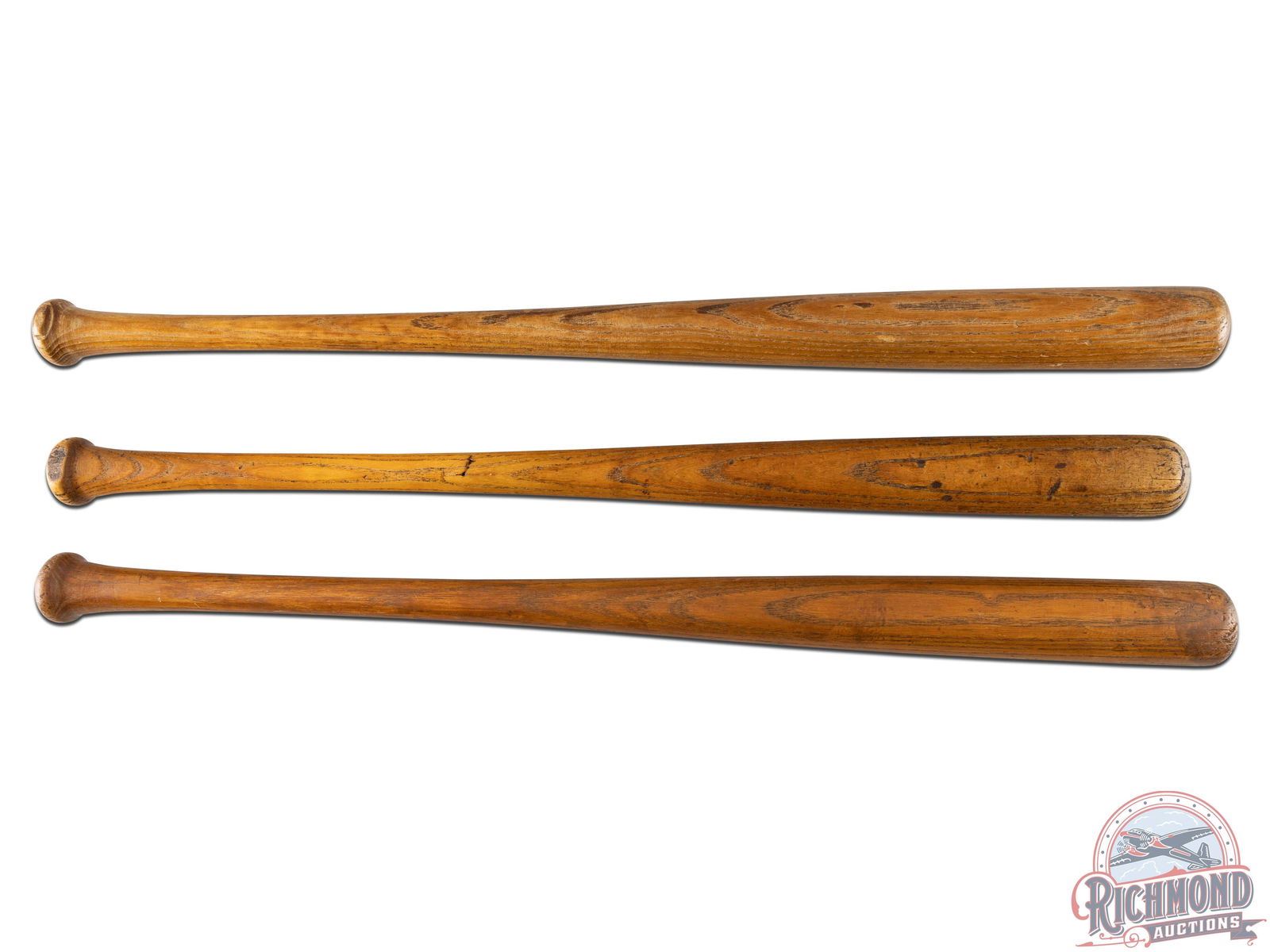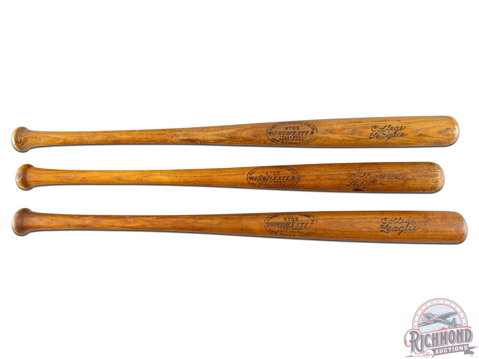 Lot of three original Winchester College League baseball bats in different sizes. Constructed of high-quality, straight-grain white ash with a golden-brown finish. All three bats have good, clear markings with general age and use wear including dings and nicks. The 36" has a very small chip on the handle and stress marks on the barrel, near "College League." The 35" is very nice with small stress marks and minor loss along the tip of the barrel. The 34" bat handle has been sanded down/modified in two places to allow grip or wrist movement in the swing. The neck exhibits several stress fractures with loss. Overall, a very nice grouping of all three lengths Winchester made available in this particular bat model.