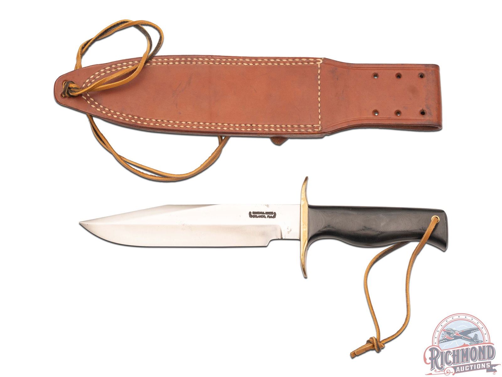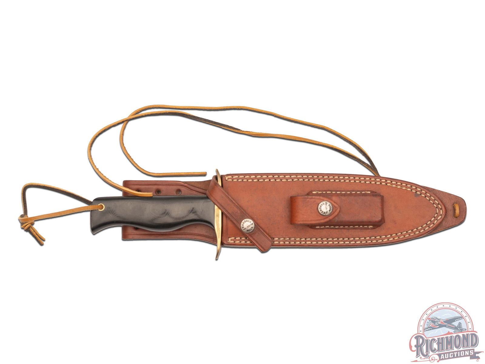 This RMK custom features a 7-1/2" clippoint blade from 1/4" stock. The top cutting edge is sharpened. Double sided brass hilt. Approximately 4 1/2_ durable black Micarta Border Patrol style handle. Extra-heavy 7/8_ wide tang extends through a channel in the handle, which is firmly fastened with factory epoxy. Wrist thong of leather through brass ferrule in the handle. Includes factory Model C leather sheath with hone pocket. Honing block included.
