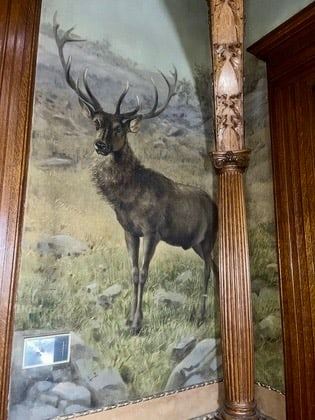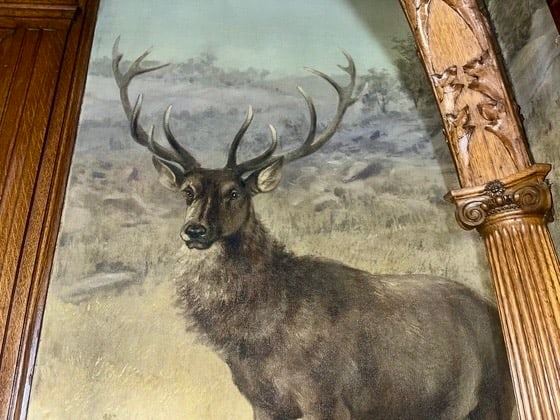 Measures 29" wide by 57" tall. This beautiful painting depicts a large, 13 point red stag deer at full stance. This piece closely resembles A.B. Frost's original "The Bull Elk" that is pictured in "The Sporting Art of Arthur Burdett Frost" by Colleen F. Storey, James A. Casada, Ph.D. and Charles Wechsler on page 60 and 190. Part of the Vandling mansion wallpaper collection.