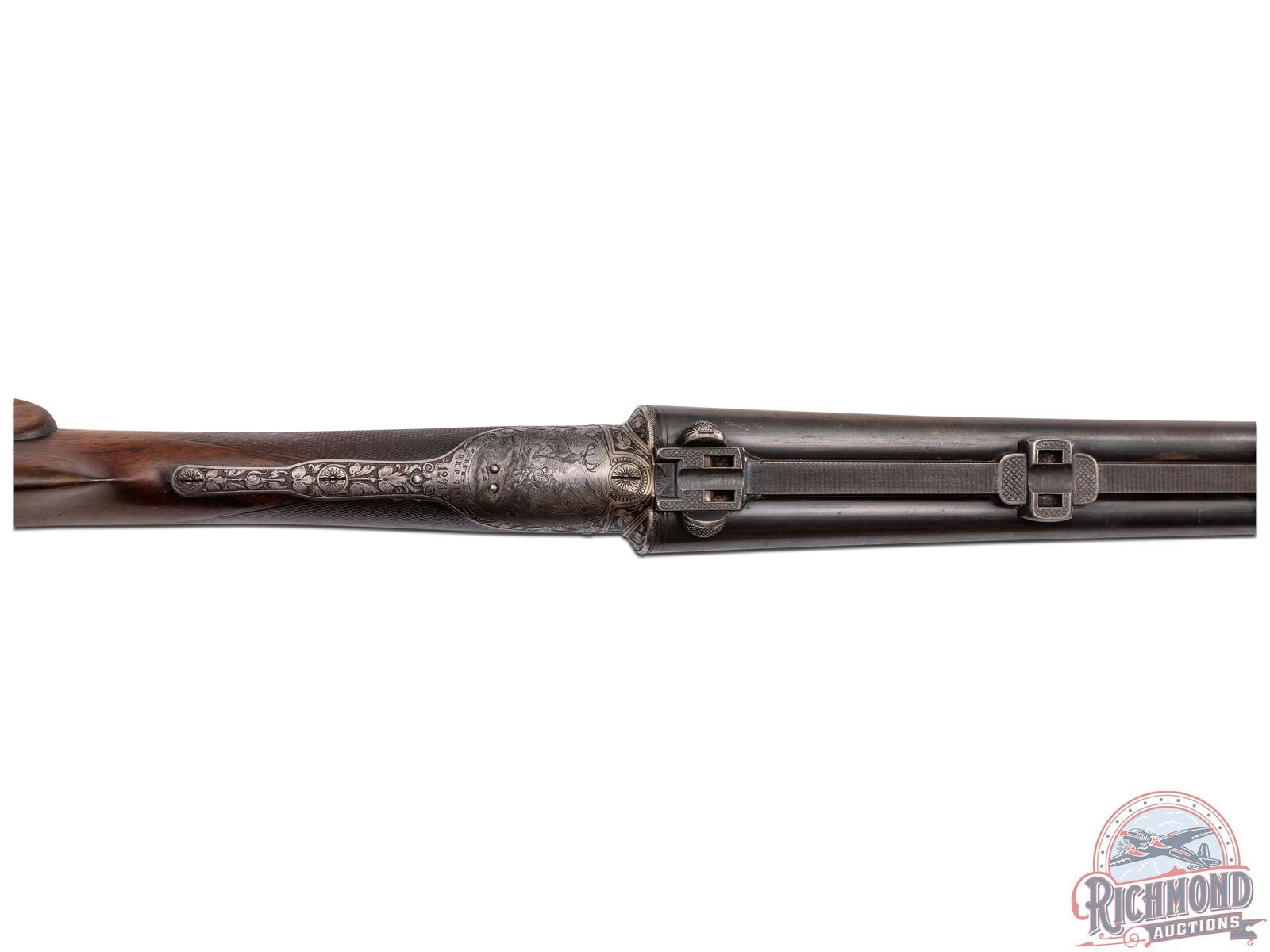 Overall 80% fading barrel blue and Damascus scene with areas of brown patina. Action has faded to a silvery brown. Wood has traces of finish with checkering worn flat. Stock has one crack on comb peak. Good bores and mechanics.