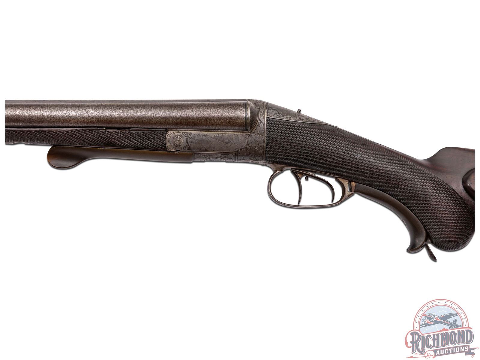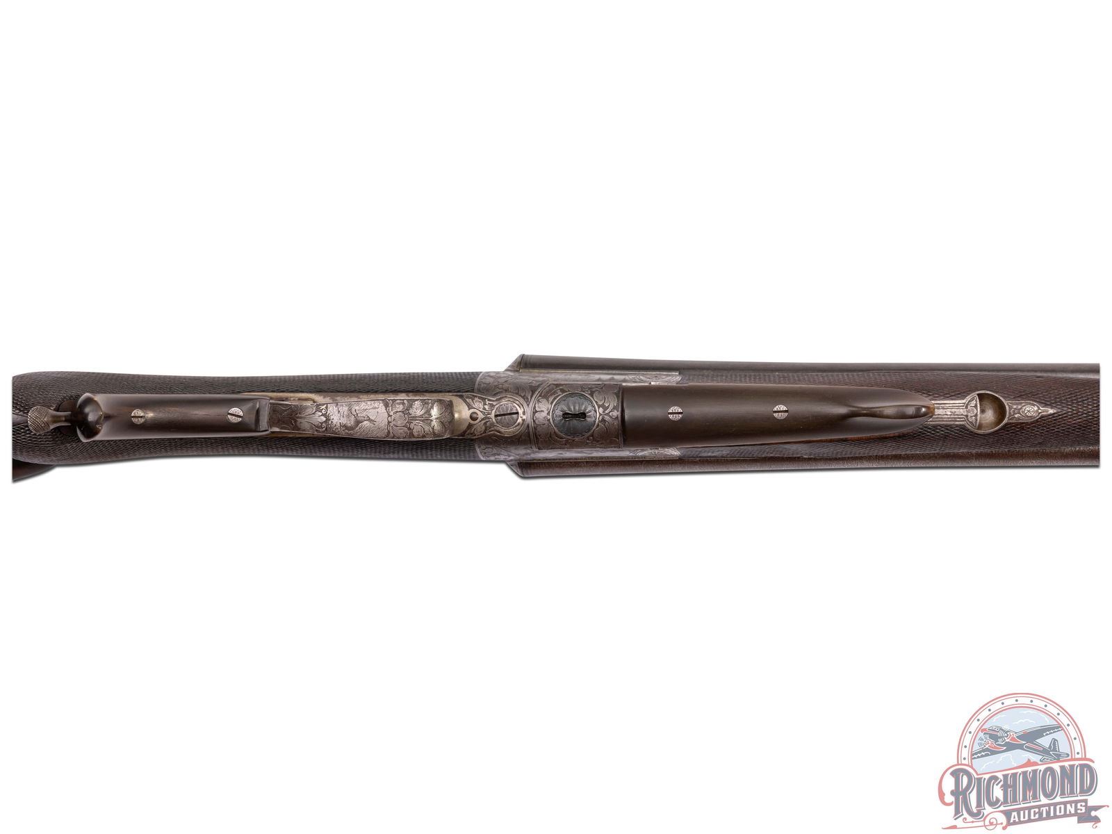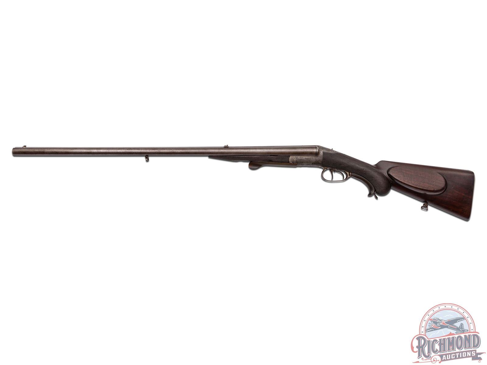 Made in Suhl, Germany by Imman Meffert, circa 1910. 27-5/8" Damascus 16 gauge barrel beside 43 Mauser caliber steel rifle barrel. Maker marked matted rib with rifle sights, extractors, and sling swivels. Underlever floral and game scene engraved action with Meffert patented "Grip Safety" with double triggers (front trigger is a set), cocking indicators, and steel trigger guard. Walnut checkered round knob pistol grip stock with right handed cheekpiece and attached steel butt plate. Walnut checkered splinter forearm with latch release and horn opening lever and grip safety bar. LOP: 14". DAC: 1-1/4". DAH: 2-1/4". CALIBER: 16/43 Mauser. S/N: 403. FFL STATUS: Curio & Relic.