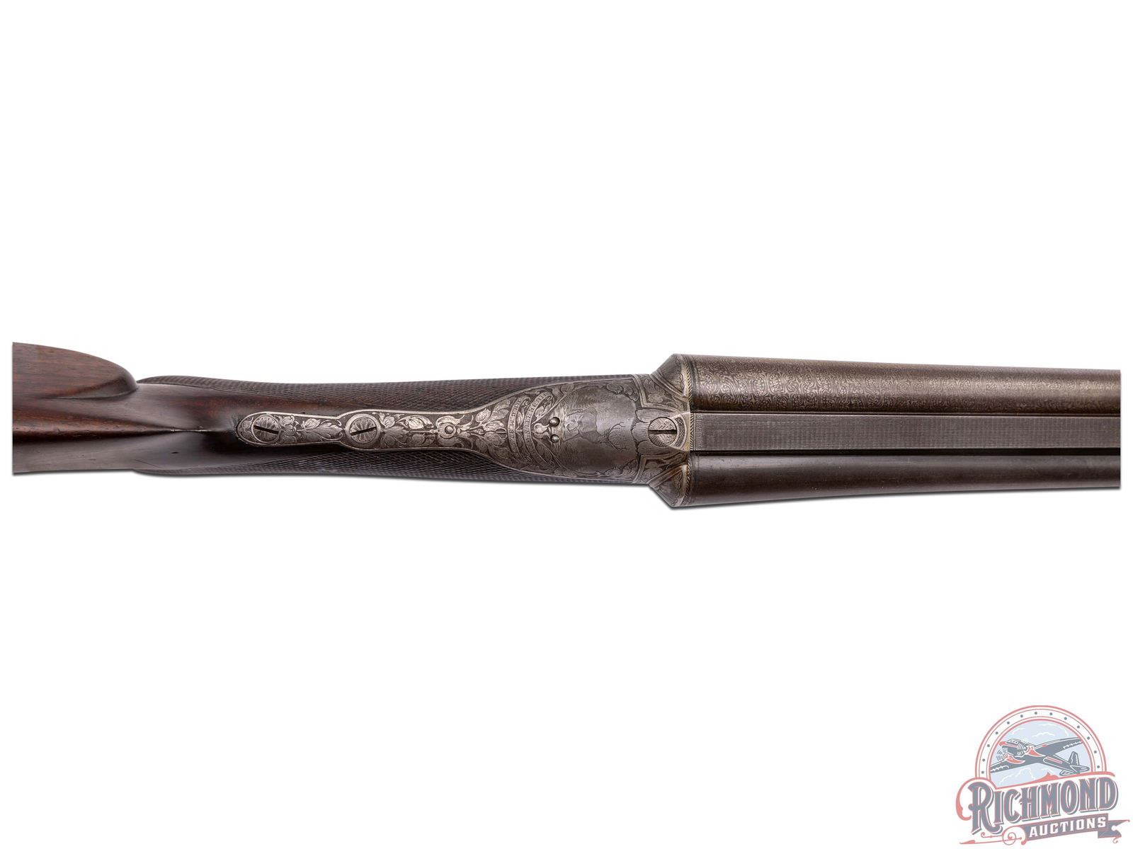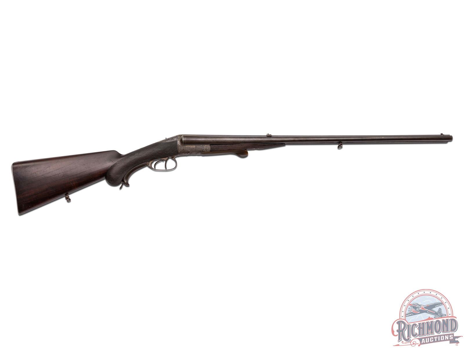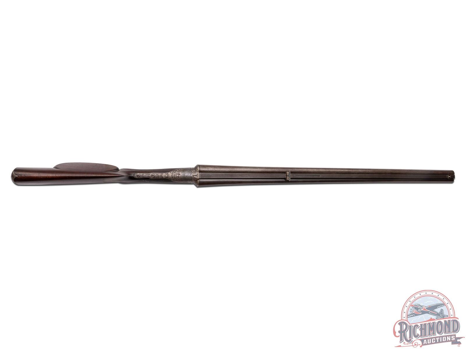 Made in Suhl, Germany by Imman Meffert, circa 1910. 27-5/8" Damascus 16 gauge barrel beside 43 Mauser caliber steel rifle barrel. Maker marked matted rib with rifle sights, extractors, and sling swivels. Underlever floral and game scene engraved action with Meffert patented "Grip Safety" with double triggers (front trigger is a set), cocking indicators, and steel trigger guard. Walnut checkered round knob pistol grip stock with right handed cheekpiece and attached steel butt plate. Walnut checkered splinter forearm with latch release and horn opening lever and grip safety bar. LOP: 14". DAC: 1-1/4". DAH: 2-1/4". CALIBER: 16/43 Mauser. S/N: 403. FFL STATUS: Curio & Relic.