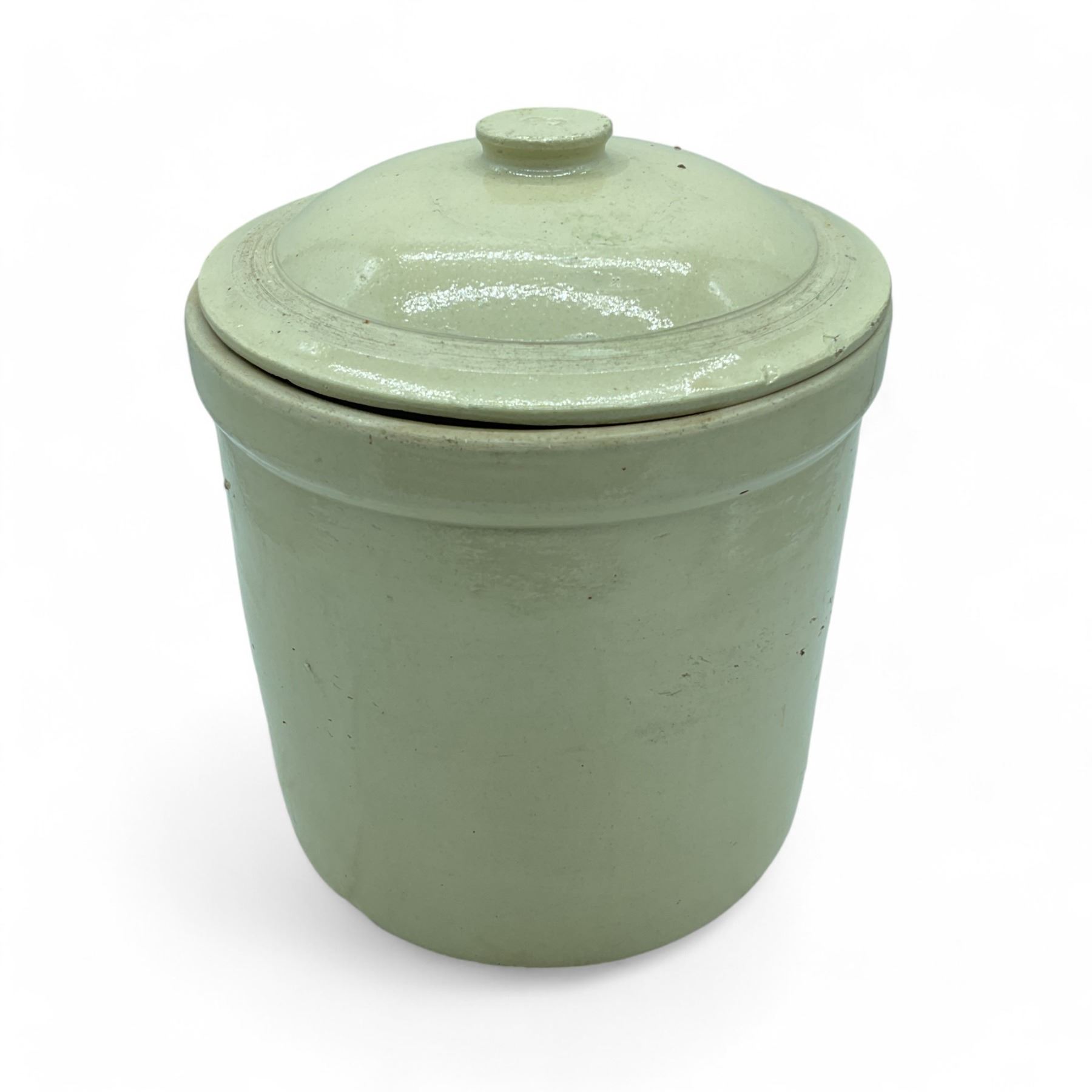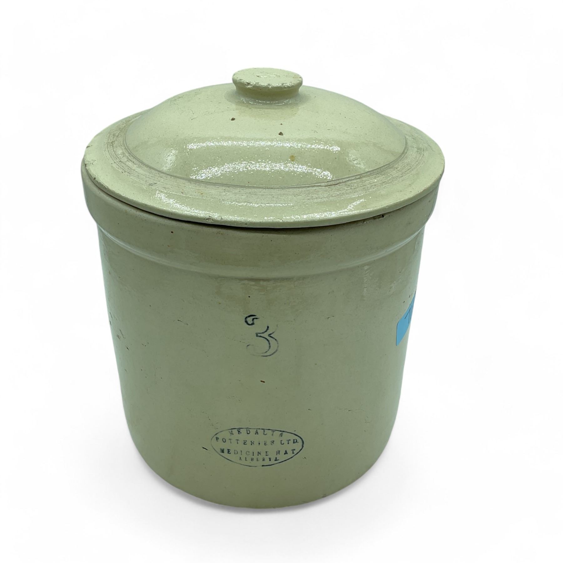 Medalta Potteries LTD Stoneware Crock with Lid, 10-1/2" Tall x 10-1/4" Diameter (at widest part), Marked: "3" and "Medalta Potteries LTD. Medicine Hat Alberta"