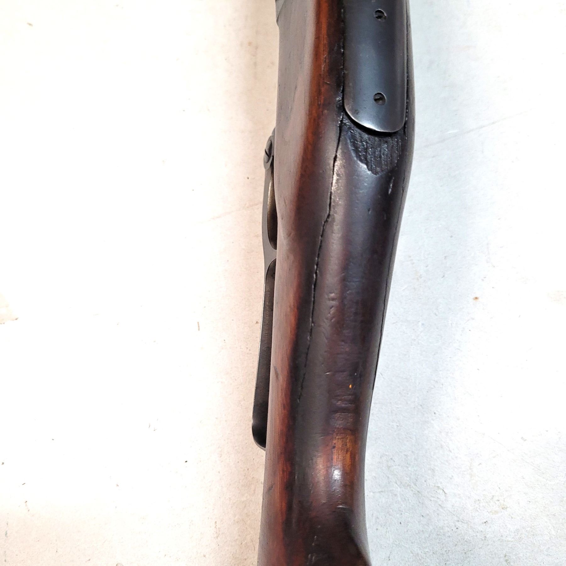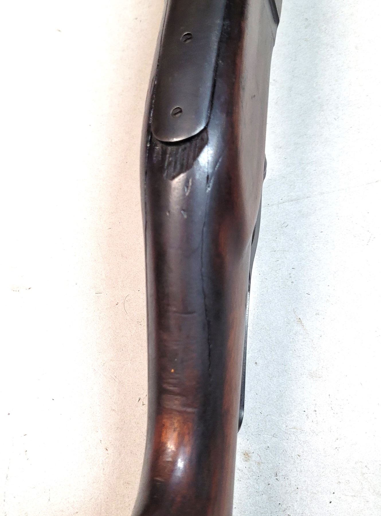 The forestock is in good condition however the buttstock is cracked back of the tang. Missing original buttplate.