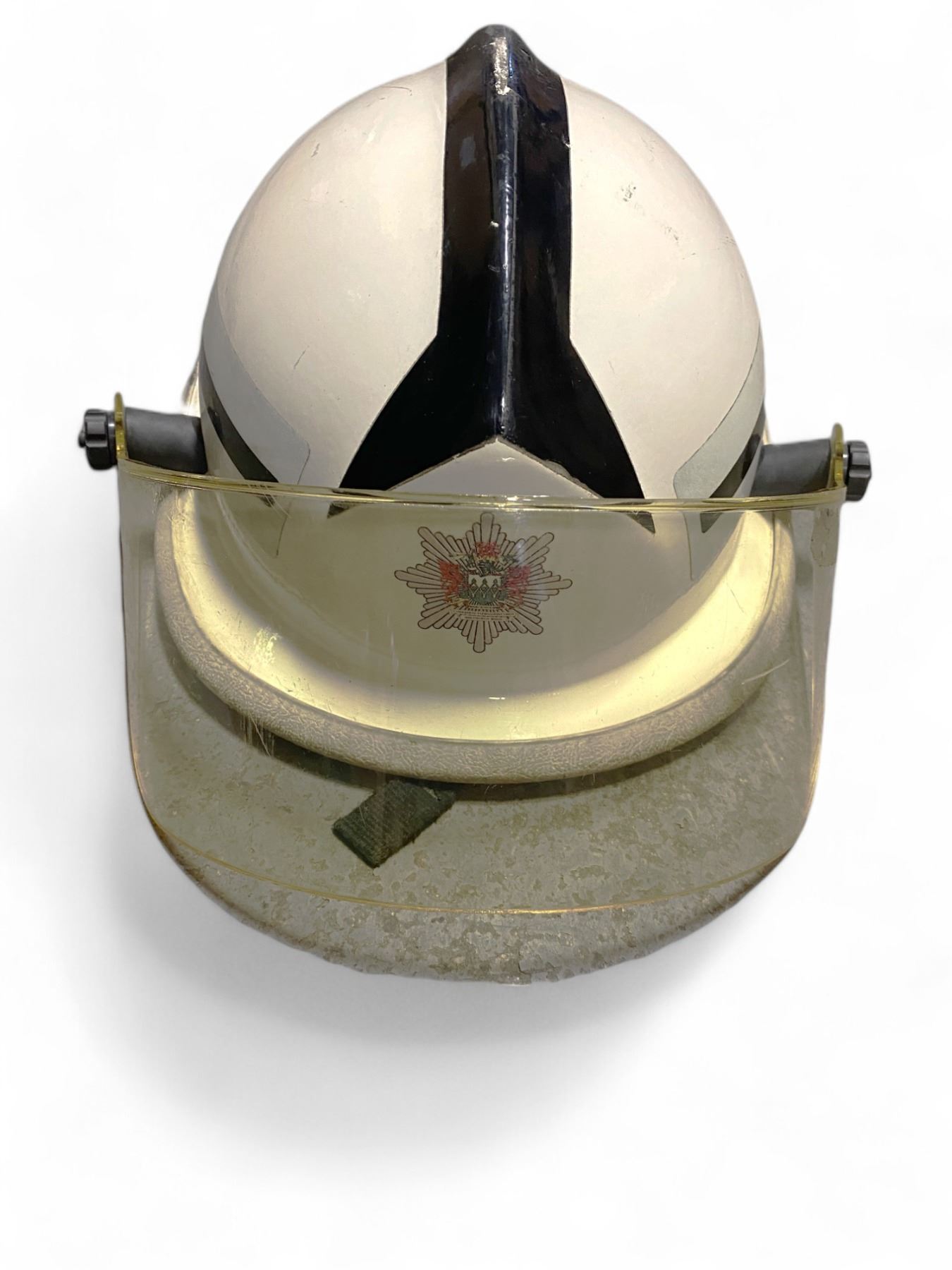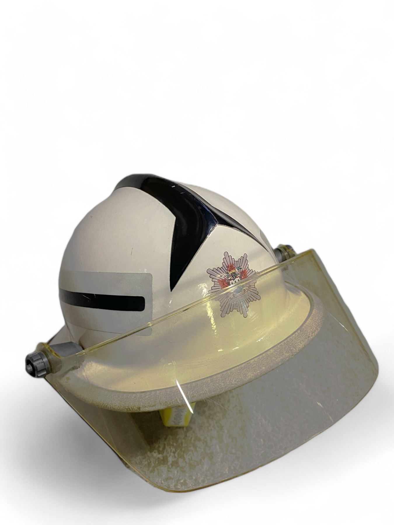 The MSA Cairns 660C Metro Composite Fire Helmet with popular retractable Defender Visor, which can be easily raised or lowered with a gloved hand. *These are in used condition with signs of wear and heavy usage in the field and sold as novelty only*
