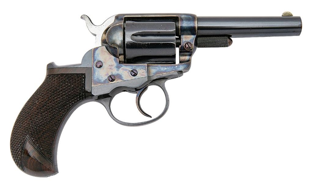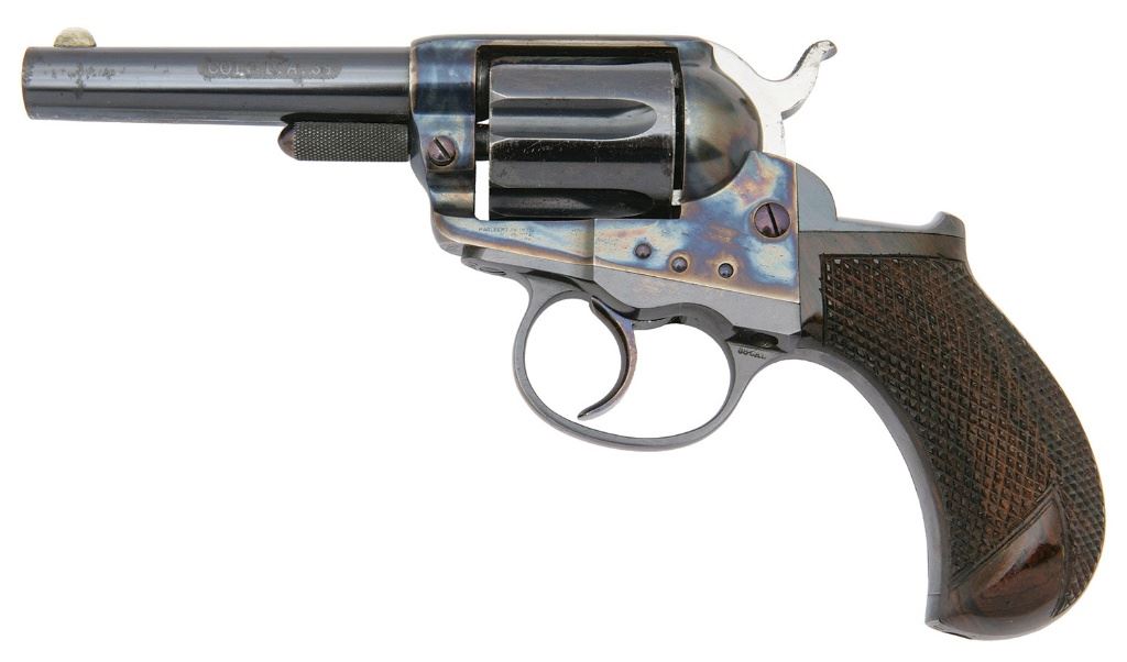 serial #1343, 38 Colt, 3 1/2'' barrel with mostly bright very good plus bore showing a few spots of light oxidation and strong rifling throughout. This is a wonderful first year production Sheriff's Model revolver with the barrel, cylinder, backstrap and triggerguard retaining about 96% original blue with just a few small spots flaking to gray-brown patina at the muzzle and cylinder, light disassembly marks along the bottom of the barrel and some thinning along the backstrap. The two-line barrel address is crisp and clear and the etched ''COLT D.A. 38'' panel on the left side is nearly perfect. The ''38 CAL'' on the triggerguard is likewise quite crisp but the frame patent dates are rather poorly struck. There are a few tiny flaws in the metal on the right side of the frame but they are unobtrusive and the frame retains vibrant case-hardened colors throughout with just a little high edge wear and minor silvering. The sides of the hammer are bright and the back surface, screw heads and trigger retain almost all of their brilliant fire blue with just a little silvering along the trigger face. The checkered one-piece rosewood grip is pencil-numbered to the gun and remains in excellent condition showing just a few lightly chipped points and retains almost all of its original varnish. The loading gate is assembly-numbered ''140'', the underside of the barrel is erroneously numbered ''314'' and the cylinder, backstrap and triggerguard are all matching the frame. The action will require some mechanical attention as all of the hammer notches are worn but it still functions well in double action with excellent timing and lockup. Really an excellent example, these early guns are especially handsome with their checkered rosewood grips. (13B11739-111) {ANTIQUE} (5000/7000)