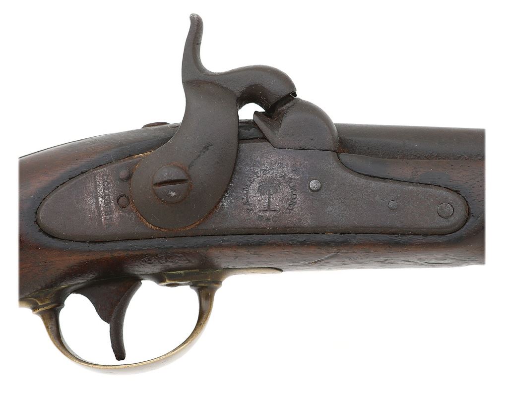 .54 cal, 8 1/2'' round barrel with a lightly oxidized bore. This rare pistol has seen some honest use, the metal surfaces mostly toned to a deep oxidized plum-brown patina showing scattered areas of old oxidation and some light pinprick pitting. The brass hardware is a mild ocher and pale goldenrod patina showing some scattered light dings and no doubt an old lightly cleaning. The markings have softened from the years, the center of the lockplate retaining palm tree surrounded by ''PALMETTO ARMORY / S (Star) C''. The rear of the plate retains a legible ''COLUMBIA'' though strangely the second line with ''SC'' and the date has been ground off very long ago, the patina in this area similar to the balance of the pistol. The palm tree proof at the breech is partially visible and the ''Wm Glaze & Co'' markings are discernible though faint. The smooth walnut stock remains in very good condition showing some darkening from the years and mild oxidation leaching, the left side with a bit more wear showing a minor drying crack at the lock screw, small divot on the flat and a stretch of moderate dings. There is a small punch mark on the inside of the lockplate, the inside barrel and breech plug show matching assembly number ''V1'' while the underside of the bolster shows a ''1''. A simple hickory ramrod is included, the half cock notch is worn and the lock otherwise seems to function well mechanically at full cock. An honest example of the rare Palmetto Armory pistol, only about 1000 of which were produced and are considered secondary Confederate martial arms. (13C10575-82) {ANTIQUE} (1500/2500)