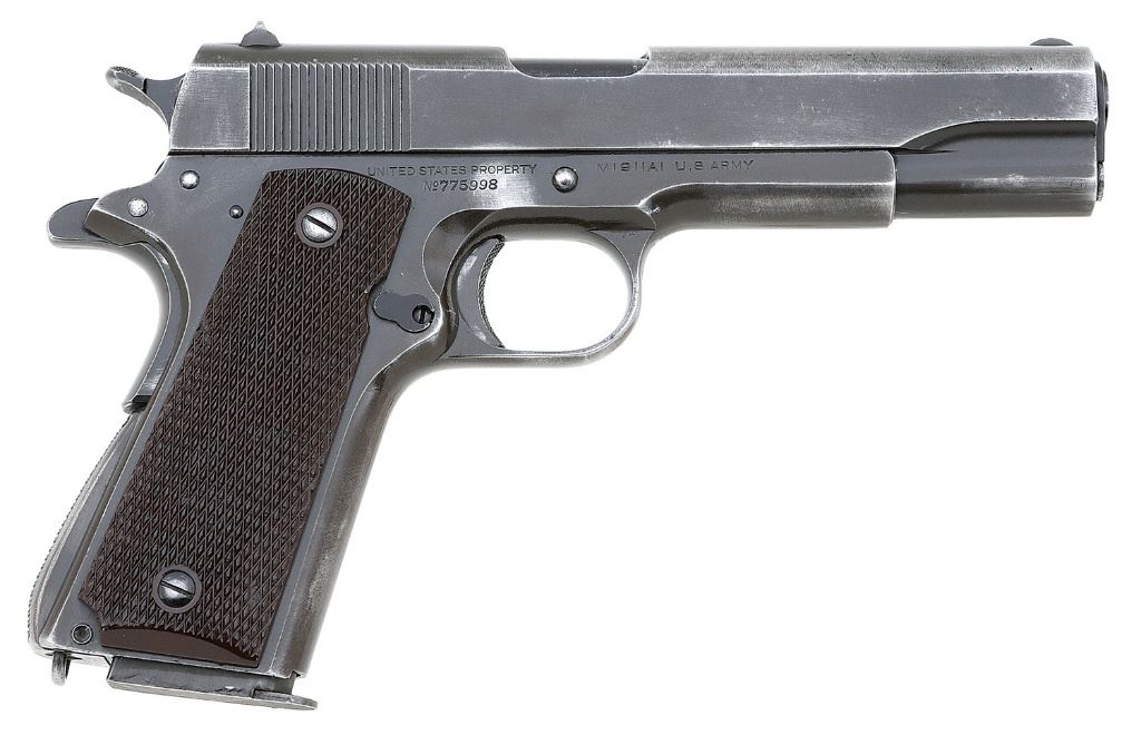 serial #775998, 45 ACP, 5'' Colt barrel with an excellent bore. This early war gun remains in about very good condition. The metal surfaces retain about 90% restored arsenal grade Parkerized finish showing high edge wear, the straps have thinned to brown and gray in addition to handling marks and slight thinning of the finish in other areas. The fully checkered Coltwood grips lack reinforcing bars on the rear of the panels, and reinforcing rings around the screw holes, mold marks are present on the back, and they remain in about very good plus condition showing light handling marks. All of the controls and small parts appear correct for the period of manufacture, and the slide is correctly serial numbered to the gun under the firing pin stop. Colonel Broberg's inspection stamp and the proof marks remain crisp as are the other markings. It includes an unmarked seven-round magazine. A solid early war Colt. (8A11810-10) {C&R} (1500/2000)