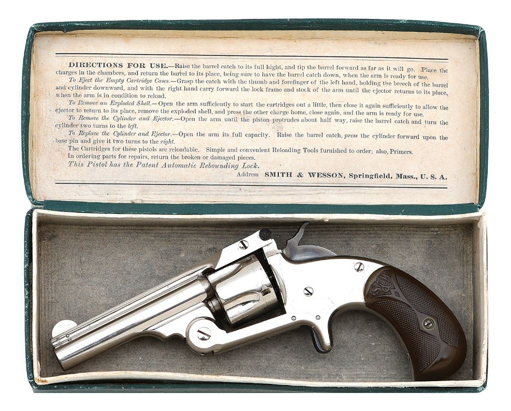 serial #19693, 32 S&W, 3'' barrel with a bright near-excellent bore showing a few scattered pinprick pits with strong rifling throughout. The metal surfaces retain 99% original nickel finish, showing minimal handling wear throughout with a few negligible scattered flecks of clouding and oxidation staining visible only under direct light. The hammer and trigger have toned to a smoky gunmetal patina with the hammer showing handsome case-hardened colors. The checkered birdshead grips remain excellent having toned to a warm chocolate and showing little if any handling wear. Timing and lockup appear sound and the ejector functions robustly, and included is the original green hinged cardboard box, correctly end-labeled with orange label, which remains in excellent overall condition showing only minimal edge wear. A lovely boxed example. (26A10826-395) {ANTIQUE} [Dr. W. Lloyd Hudson Jr. Collection] (1000/1500)