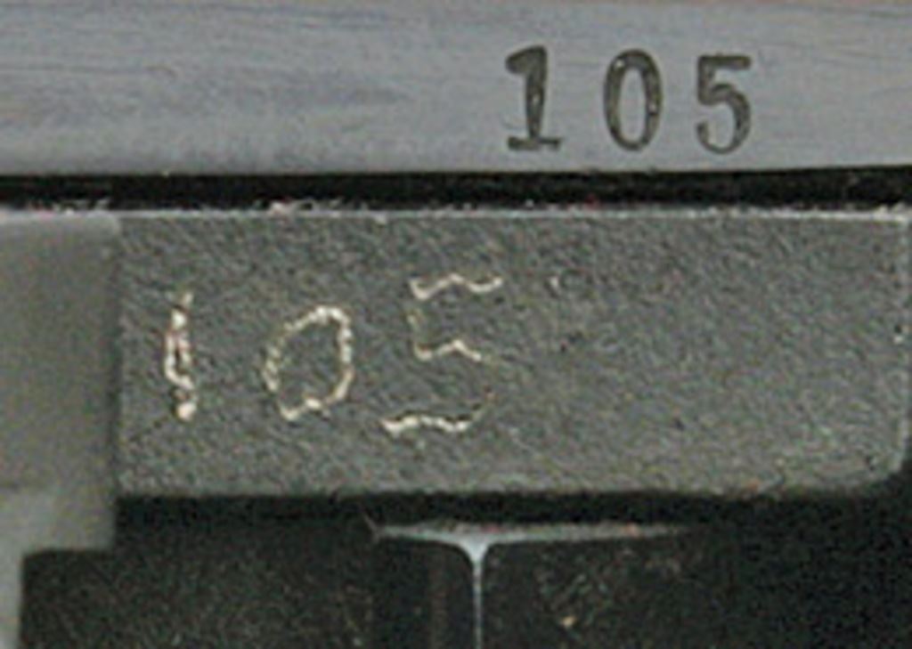 serial #105, 308 Win, 22" light weight barrel with a bright excellent bore. This is a nice AB/S22L rifle with no proof mark on the barrel. The barrel features the early single line address and retains 99% plus original blue while the action retains 98% original blue with only a couple tiny light storage marks on the right side of the receiver, the hand-fitted breechblock is numbered to the gun. The checkered walnut pistolgrip buttstock and semi-beavertail forearm rate near excellent having an attractive straight grain with early-style wraparound checkering on the forearm, the only apology being a small 1/4" shallow dent in the checkering on the left side of the forearm. The buttstock and forearm are numbered "105" in black pen, the forearm hanger is unmarked. The rifle is equipped with a quarter rib and includes a set of early-style vertically split rings in a red cloth bag and a factory manual. The included June 13, 1989 dated factory letter confirms configuration and lists the rifle being shipped in April 1967. To our knowledge there is no verification of any other non-prefix rifles without a proof mark. A near excellent rare variation lightweight No. 1 rifle. (5B11739-121) {C&R} (1800/2400)