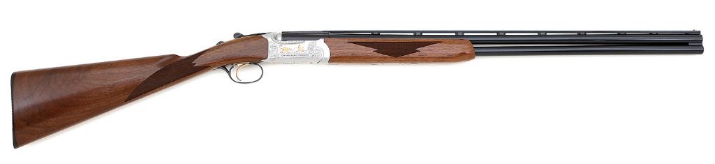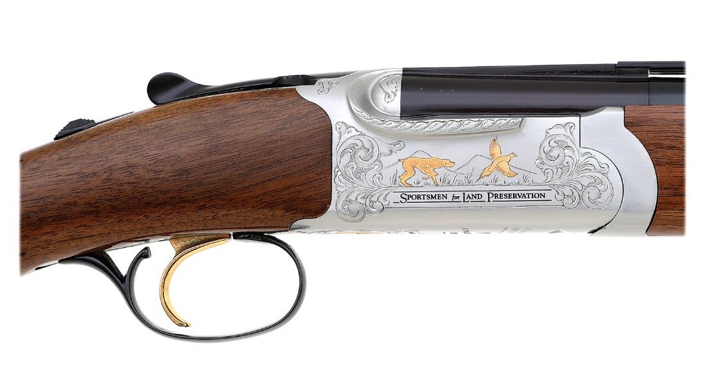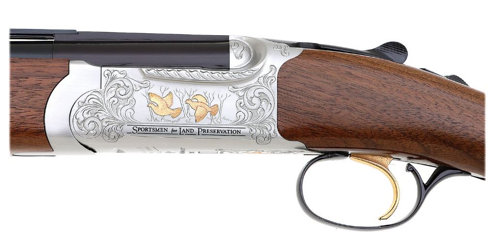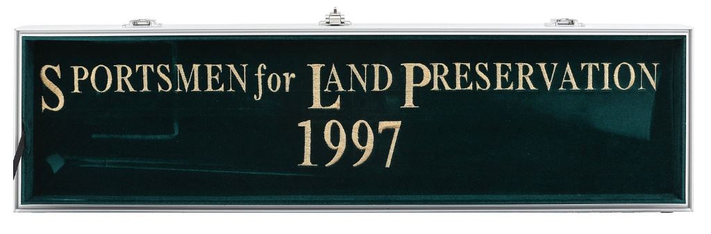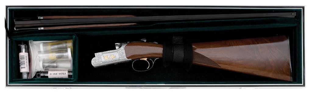 serial #420-06689, 28 ga (2 3/4''), 28'' ventilated rib screw-choked barrels with bright excellent bores. This unique Red Label was engraved by master engraver John Adams for the 1997 Fourth Annual Banquet of the Sportsmen for Land Preservation during-which it was auctioned off. The barrels retain about 98-99% original blue, the bottom barrel showing a few tiny dings and light handling marks a few inches behind the muzzle. The stainless steel action rates about excellent showing a few sparse handling marks and is tastefully embellished with excellent quality detailed foliate scrollwork and punch-dot shading. The gun also features nice little gold-inlaid game scenes with a short-haired pointer and pheasant on the right, pair of grouse on the left and a woodcock in flight on the bottom. Both sides are etched beneath the scenes ''SPORTSMEN FOR LAND PRESERVATION'' while the bottom is emblazoned ''4th / ANNUAL BANQUET / 1997 / ONE OF ONE'' and the work is signed by Adams to the right of the triggerguard. The trigger is gold-washed and the guard retains all of its original blue. The checkered straight grip walnut buttstock and forend remain in near excellent condition, the buttstock with a few sparsely scattered light handling marks, the checkering remains crisp and side sides of the buttstock exhibit some subtle but attractive feathercrotch grain figure. Length-of-pull to the grooved black plastic Ruger buttplate is 14 1/4'' with drops of 1 1/2'' and 2 1/2''. The rib is sighted with a single brass bead and the action with single mechanical trigger seems to function well mechanically. The gun includes its original heavy duty Americase aluminum case showing some light dings along the exterior, with banquet plaque on the lid and the interior lined in green velvet. The interior lid lining is boldly stitched with ''SPORTSMEN for LAND PRESERVATION / 1997'' in gold thread and the case contains the original manual, pair of keys, pair of bore brushes and choke wrench. Five chokes are included: full, modified, improved cylinder and two cylinder. This is a wonderful opportunity for the Ruger collector to acquire a unique 28 gauge Red Label. (13D11755-3) {MODERN} (4000/6000)
