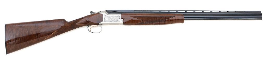 serial #38782NVM83, 410 bore, 26'' ventilated rib Invector Plus choked barrels with bright excellent bores. The barrels retain 98% original blue and the balance of metal surfaces retain a similar amount of original coin gray finish with some scattered tiny specks of fine oxidation staining and the trigger retains nearly all of its gold finish. The frame is embellished with handsome foliate scroll and game scene engraving with quail and grouse scenes. The checkered straight grip high gloss stock and schnabel tip forend rate excellent with a few minor handling marks and a 14 1/4'' length of pull. This 1995 manufactured handsome small bore features a single silver bead front sight, single selective trigger, non-automatic safety and robust ejectors. Included is a manual and pair of Invector Plus skeet chokes. (10B11788-1) {MODERN} (1800/2200)