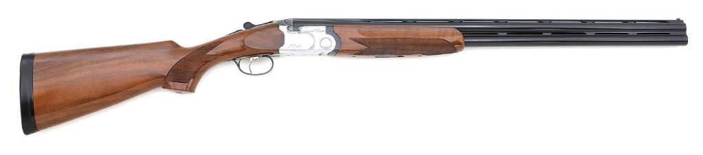 serial #E96076B, 12 ga., 28'' ventilated rib screw-choke barrels with bright excellent bores. The barrels retain 97-98% original blue with scattered spots of fine oxidation staining, and light handling marks. The forend iron and triggerguard retain perhaps 95% original blue with silvering along the high edges and the silver-finished frame is in excellent condition with a minor handling mark or two and is embellished with light engraving and matting atop the fences and lever. The trigger retains about 60% gold with the face toned to a bright silver patina. The checkered pistolgrip walnut stock and forend are in very good plus condition with light handling marks and features a 14 1/2'' length of pull to the factory pad and has an inlaid Beretta Logo in the bottom of the grip. The shotgun locks up tight and is on-face with the lever coming to rest just right of center and features a single selective adjustable trigger, non-automatic safety, inertial hammers, and is sighted with a rear brass bead and red fiber-optic style front bead. Included are a factory box correctly end labeled and number to the gun, manual, choke tube wrench and eight chokes, marked as (3) skeet, (2) improved cylinder, (1) modified, (1) improved modified, and (1) full. A fine Italian sporting shotgun. (10A11690-33) {MODERN} (1000/1500)