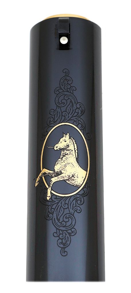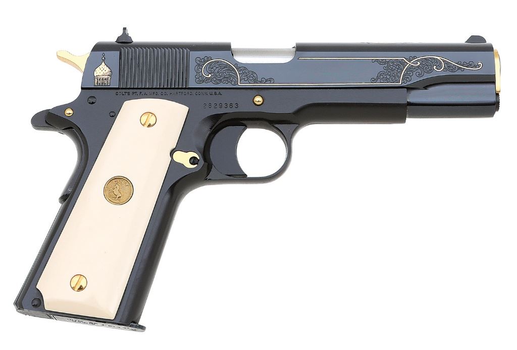 serial #2829363, 38 Super Auto, 5'' barrel with an excellent bore. This lovely pistol was commissioned and distributed by Lew Horton and remains as-new-in-box. The pistol is tastefully engraved with wedges of fine scroll engraving on both sides of the slide highlighted by gold boarders, the right side has Colt's ''Blue Dome'' while the right has the timeless ''Rampant Colt''. The top of the slide has a half ''Rampant Colt'' flanked by fine engraving. The pistol retains 99% plus original Colt Royal blue, the barrel bushing, slide stop, magazine catch, thumb safety, grip screws, and hammer are gold finished. The grips are smooth faux ivory with gold Rampant Colt medallions and they remain in excellent condition. This pistol features three dot sights, long trigger, and flat mainspring housing. It includes the original hard case that is correctly end labeled and numbered to the gun, a pair of factory marked nine-round magazines, a spare set of double diamond checkered rosewood factory grips in like new condition, cable lock with a pair of keys, manual, and paperwork. A beautiful 38 Super for your collecting pleasure. (8B11712-17) {MODERN} (4000/5000)