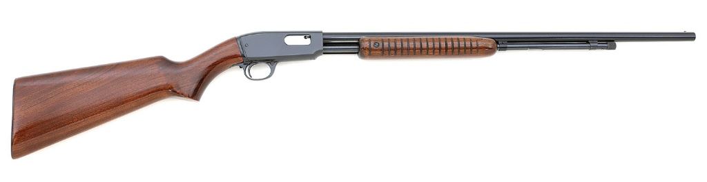 serial #208022, 22 LR Shot only, 24'' round barrel with a bright smooth bore. The metal surfaces on this 1956-manufactured rifle retain about 98% original blue with scattered light freckling, light operational wear along the slide, and few scratches. The smooth walnut pistolgrip stock and grooved forend rate excellent aside from a minor light handling mark or two and the checkered steel buttplate is a pleasing mocha patina. This is a fine example of these desirable full length smoothbores that would be hard to improve upon. (10A11523-3) {C&R} [Jim Thrash Collection] (1800/2200)