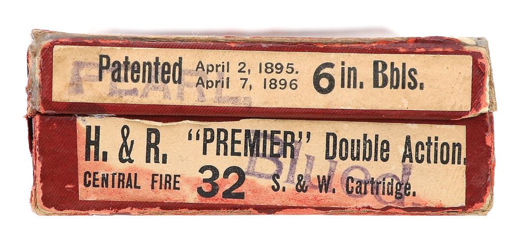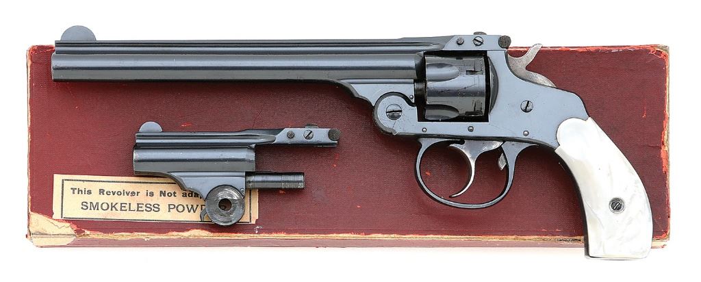 serial #A11682, 32 S&W (Short), 6” round & 2” bicycle barrels, both with an excellent bores. This lovely revolver has seen light use and remains in fine condition. The metal surfaces retain about 98% original blue showing light edge wear, a few moderate but small scratches that have lightly oxidized, and handling marks. The trigger and hammer retain robust case-hardened colors. The smooth unmarked mother-of-pearl grips rate excellent. This gun features a half-moon front sight and fixed rear sight on both barrels, both barrels and other appropriate parts are correctly numbered to the gun, and barrel to frame fit for the 6” barrel is tight (2” not tested). The spare 2” bicycle barrel includes the hook and hook spring. It also includes a red fabric covered hinged factory box that is correctly end labeled to the gun with over stamps indicating blue finish and pearl grips. The box rates about good showing a well executed repair to the seems and the cover has added cardboard glued in place on one end. A wonderful seldom seen combination barrel set. (8B11777-68) {C&R} [The Richard Littlefield H&R Collection] (1500/2000)