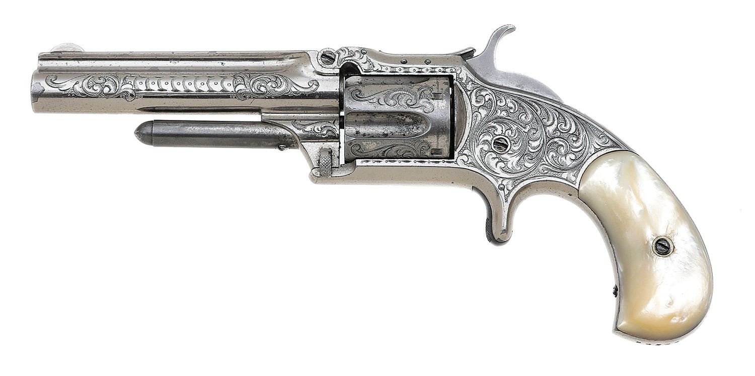serial #98596, 32 RF, 3 1/2" barrel with a bright very good bore showing scattered light pitting and strong rifling throughout. The metal surfaces of this Second Issue revolver retain 98% original nickel finish, showing minimal handling wear and clouding slightly throughout with intermittent flecks of bubbling, most noticeably in the protected areas of the barrel rib, and loss concentrated primarily in the cylinder flutes toning to a dull gray. The sides of the revolver display handsome New York-style foliate scroll engraving with punch-dot backing along the sides, absent on the belly, with the flanks of the barrel and frame surrounding the cylinder showing a line-and-dot geometric pattern with a similar pattern flanking the barrel address atop the rib with light geometric line work along the backstrap. Markings and engravings remain crisp throughout and the smooth mother-of-pearl grips fit quite nicely and remain excellent, with the only apology being two minute checks forming outward from the escutcheon on the right panel. A nicely embellished No. 1 1/2. (26A10826-473) {ANTIQUE} {Dr. W. Lloyd Hudson Jr. Collection] (1500/2000)