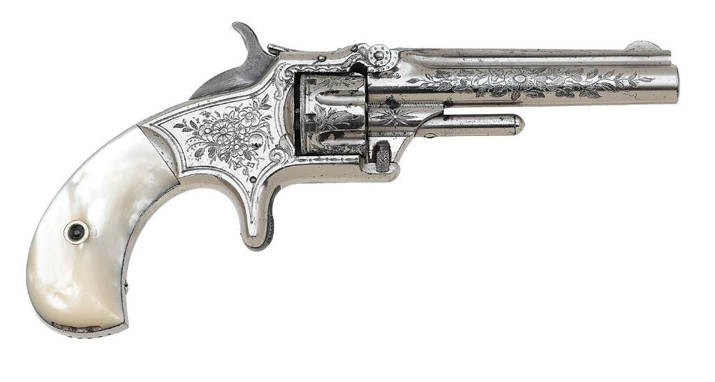 serial #99341, 22 RF, 3 3/16'' barrel with a bright good bore showing scattered pitting focused chiefly at the breech with evident rifling throughout. This is a rather darling Third Issue engraved with well-executed floral motifs, showing bouquets on the sides of the frame with familiar sunburst and floral ''daisy-chain'' forms along the barrel assembly, and geometric bordering and foliate flourish along the top and grip straps; perhaps most charmingly is the presence of seven distinct, individual floral designs on each of the cylinder flats depicting the same form moving through the cycle of bloom and death. It retains 98% original nickel finish showing minimal handling and high edgewear throughout with perhaps the odd spot of bubbling; the areas of loss show fine oxidation staining under direct light, and the hammer and trigger have toned to an even gunmetal. The smooth mother-of-pearl grips rate near excellent, showing very light handling wear with a few flecks of darkening on the left panel with the main apologies being two chips at the heels of each panel, the left-side showing an old synthetic fill repair and the right remaining unfilled. Mechanical function appears sound though there is sometimes mild friction between the hammer and cylinder stop, and the gun exhibits no noticeable play. An unusual and charming Third Issue. (26B10826-579) {ANTIQUE} [Dr. W. Lloyd Hudson Jr. Collection] (1200/1800)