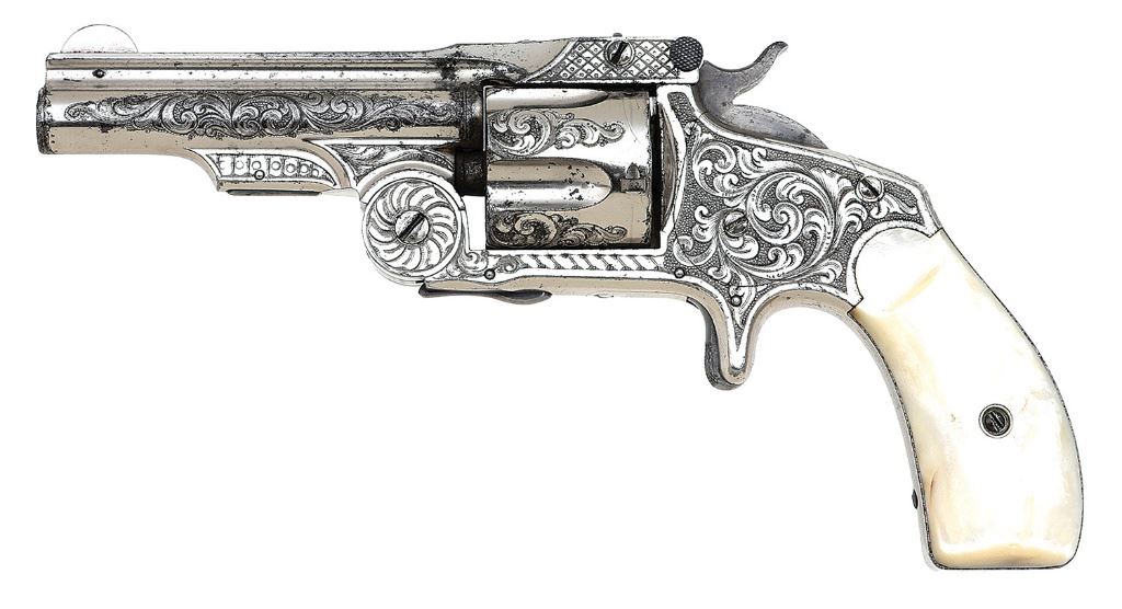 serial #9760, 38 S&W, 3 1/4" barrel with a bright very good bore showing scattered pitting throughout with strong rifling. This is a lovely First Model engraved in classic New York-style, showing punch-dot backed foliate scroll along the frame, barrel, and cylinder, with the window being framed by geometric linework and spiral motif around the hinge screw with another punch-dot backed foliate motif and light undulating borderwork along the backstrap and a charming art-deco flourish around the rear sight latch; the hammer, trigger, and ejector spring have toned to a smoky gunmetal patina and the sight latch retains vestiges of rich case-hardening. It retains 96% original nickel finish with loss scattered mainly about the cylinder and breech with edge wear around the muzzle, scattered light handling marks, and oxidation staining in the areas of loss. The smooth mother-of-pearl grips remain excellent showing no handling wear or checking to speak of with the only apology being a slight gap in the fit of the right panel. Timing and lockup appear sound and ejector function remains robust. A lovely ''Baby Russian.'' (26B10826-690) {ANTIQUE} [Dr. W. Lloyd Hudson Jr. Collection] (2000/4000)