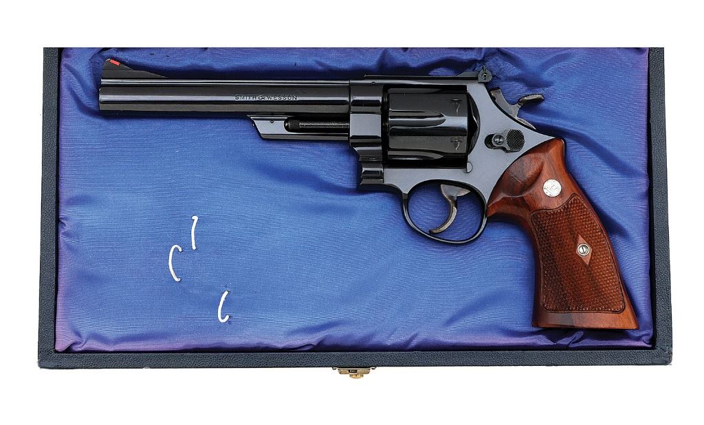 serial #S159530, 44 Magnum, 6 1/2” heavy barrel with an excellent bore. This lovely mid-1950’s revolver remains in excellent condition with several nice accessories. The metal surfaces retain about 97-98% original blue showing light handling marks, several tiny spots of pinprick pitting on the frame, and a moderate scratch on the left side of the frame below the thumb latch. The top of the grips distract the eye from the scratch making it less noticeable. The .500” target trigger and .500” target hammer retain beautiful swirls of case-hardened colors. The diamond checkered goncalo alves “coke bottle” grips feature silver S&W medallions, extractor cut, and remain in near excellent condition showing a tiny chip on the toe of the left panel. This gun features a red ramp front sight, white outline micro adjustable rear sight, and all the appropriate parts are correctly numbered to the gun. It includes the original factory blue hard case, heavily knurled aluminum handled sight adjustment tool (screwdriver), cleaning rod, bore brush, and bore mop. The accessories rate excellent while the hard case rates very good plus with light edge wear, the elastic loops for the accessories are lightly stretched. An excellent investment for the collector. (8B11534-87) {C&R} (2000/3000)