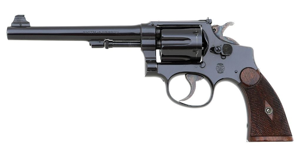 serial #402962, 38 Special, 6'' barrel with a bright excellent bore. This lovely fourth change revolver appears to be virtually unfired and remains in splendid condition. It retains about 99% plus original blue showing a tiny amount of muzzle wear and few insignificant handling marks. The smooth service trigger and service hammer retain beautiful bold case-hardened colors. The diamond checkered walnut factory grips are numbered to another gun but remain in excellent condition. This gun features a Marbles bead front sight, King white outline ''U'' notch slider in a factory adjustable rear sight, and all appropriate parts are correctly numbered to the gun. A superb condition pre-war Target. (8A11534-97) {C&R} (1500/2000)