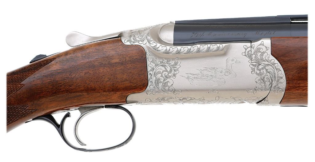 serial #410-03401, 12 ga., 28'' matted ventilated rib barrels choked improved modified and modified with bright excellent bores. This special edition Ducks Unlimited ''50th Anniversary'' over under retains 98% original blue on the barrels and engraved triggerguard while the bright polished frame remaining in excellent condition with floral pattern engraving along its borders. The frame flats are engraved with ducks in flight over ''1934'' on the left and ducks afloat over 1984 on the right and the triggerguard is marked ''1 of 1000''. The checkered walnut pistolgrip buttstock and forend rate excellent aside from a minor handling mark or two. The shotgun features a single brass bead front sight, single selective trigger, and ejectors. A lovely engraved Red Label commemorative that appears to function well mechanically and locks up tight with lever resting slightly right of center. (10C11718-5) {MODERN} (1200/1800)