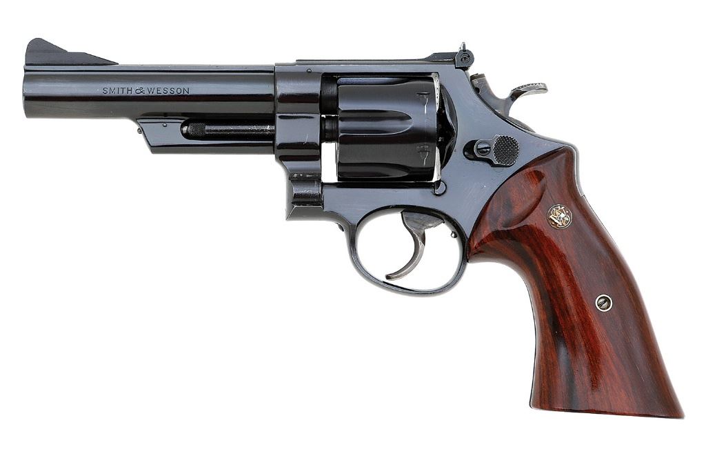 serial #S166817, 45 ACP, rare 5'' factory heavy barrel with an excellent bore. This mid-1950's five-screw Pre-Model 25 remains in fine condition and has one small added custom feature in addition to its rare barrel length. It retains about 95% original blue most of the loss is to the backstrap and knuckle area which are toning to a mottled mix of pewter and blue in addition to edge wear and handling marks. The .500'' target trigger and .500'' target hammer retain robust case-hardened colors with light operational wear. The smooth goncalo alves factory target grips feature silver S&W medallions, extractor cut, and they remain in excellent condition. This revolver features a Baughman ramp front sight, black blade micro adjustable rear sight, and all appropriate parts, including the barrel, are correctly numbered to the gun. A discreet overtravel stop has been added to the frame by an unknown professional. Although the Standard Catalogue of Smith & Wesson by Nahas & Supica does not mention the 5'' barrel in their text on the Heavy Barrel Target they do show photos of a Pre-Model 25 with a ''rare 5'' barrel'' also sporting a Baughman ramp front sight. It includes a mahogany presentation case, factory cleaning kit, and a dozen factory half-moon clips. The exterior of the case rates very good while the inside rates fair showing strong flocking but several areas of the inserts are cracked and broken. A significant find for the dedicated collector. (8B11534-71) {C&R} (2500/4000)