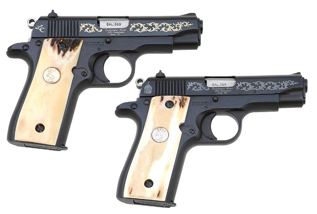 serial #00525RC & #LC0668, 380 ACP, 3 1/4'' barrels with bright excellent bores. Both of these factory adorned pistols date to 1984 and show little if any use. The Second Edition has light silver leaf scroll on the sides of the slide in addition to a silver leaf Rampant Colt on the left side and the Blue Dome on the right and is marked ''COLT MK IV SECOND EDITION.'' The Lady Colt has gold leaf scroll on the slides with a gold leaf rose on the left and ''LC'' on the right side and is marked ''Lady Colt'' in script. Both pistols retain about 99% plus original blue finish. Both are adorned with beautiful stag grips featuring Rampant Colt medallions, silver on the Second Edition and gold on the Lady Colt. Both sets show light bark, and have toned to a variety of yellow and cream colors depending on the panel, and remain in excellent condition. Both guns feature a serrated ramp front sight, drift adjustable rear sights, and thumb safeties. They are housed in a beautiful factory hardwood presentation case that is French cut for the guns with green velvet lining. The interior of the case is marked ''Colt 380 Deluxe Set'' and was originally intended for the First and Second Edition 380 Government Model. The case rates excellent and each gun includes a single factory marked seven-round magazine, a single key for the case, and a single manual. A wonderful set of Colt Government 380s. (8B11712-14&15) {MODERN} (1800/2200)