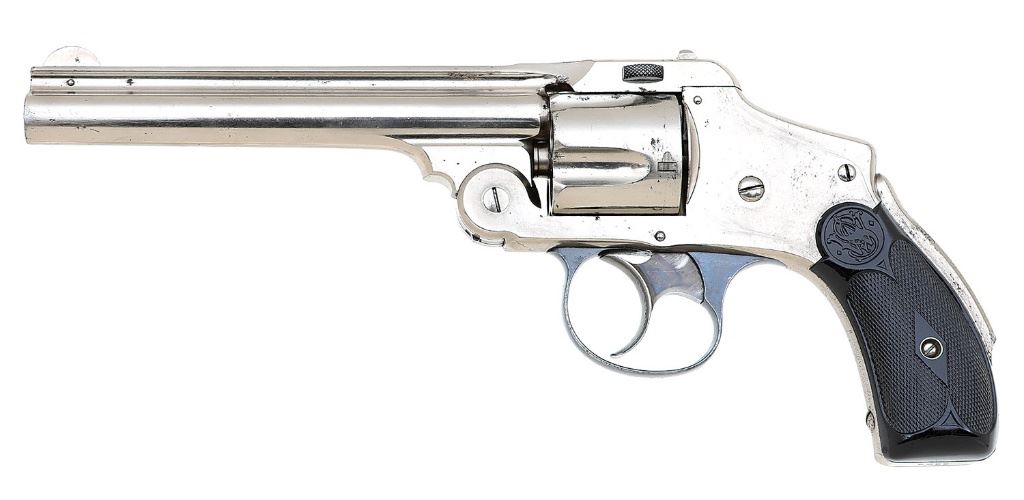 serial #3602, 38 S&W, scarce 5'' barrel with scattered light pinprick pitting showing strong rifling throughout. This First Model ''Z-Bar'' revolver features the scarce and desirable 5'' barrel. It retains about 97% original nickel plate showing a few scattered spots of oxidation, light distributed clouding, handling marks, and minor bubbling. The triggerguard and Z-Bar mechanism retain full blue although the triggerguard tones to gray under strong light while the trigger retains beautiful case-hardened colors. The diamond checkered factory hard rubber grips feature S&W monograms, are numbered to the gun, and remain in excellent condition. Barrel to frame fit has just a hint of movement, all appropriate parts are correctly numbered to the gun, it has a half-moon pinned front sight, and fixed rear sight. An excellent and desirable First Model. (8A10826-266) {ANTIQUE} [Dr. W. Lloyd Hudson, Jr. Collection] (1500/2500)