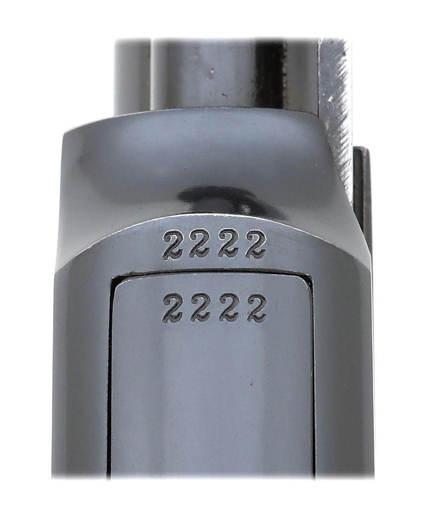 serial #2222, 22 S, L, LR, 24'' barrel with a bright excellent bore. The metal surfaces of this first year production rifle retain about 95% original blue with light wear on high edges and contact points, some scattered light abrasions and handling marks on the barrel and top of receiver, and the action bar is toning lightly to plum under bright light. The takedown screw appears to function correctly with the face toned to pewter gray with a spot of brown. The smooth pistolgrip walnut stock and flatbottomed 11-grooved forend are in very good plus condition with scattered light handling marks, a few light dings on the underside of the forend, and some light finish wear on the sides of the forend and at the heel; the checkered steel buttplate is intact with minor silvering at the edges. The factory markings are intact and crisp, and the trigger assembly is matching to the gun. The rifle is sighted with a bead front sight and a u-notch sporting-style rear sight, the tang retaining the factory drilled and tapped holes for sight mounting found on early models. A wonderfully preserved 1932-production Model 61 with an attention grabbing serial number. (14B11523-63) {C&R} [Jim Thrash Collection] (1200/1800)