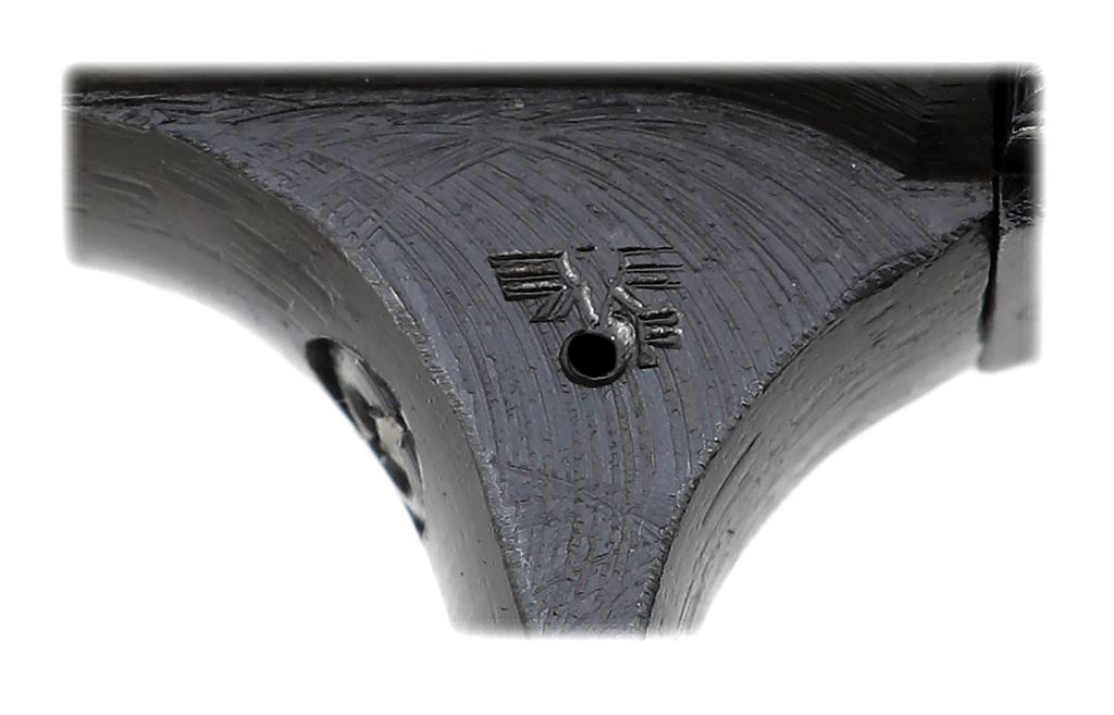 serial #489413, 32 ACP, 3 1/2'' barrel with a bright excellent bore. The metal surfaces of this Variation 3 pistol retain about 92% original rough late war blue showing some mild high edge wear, a few sparse oxidation speckles and slight thinning along the gripstraps. The alloy trigger is a medium gray tone and all markings remain crisp and clear showing ''(Eagle) / N'' commercial proofs and ''(Eagle) F'' police marking on the left-side triggerguard. The black checkered grips appear to be excellent quality Czech reproductions of phenolic resin that fit beautifully. The slide is matching the frame and the pistol includes two original magazines, one with some lightly cleaned areas and moderate silvering along the body and with ''SuS'' monogram-marked steel floorplates. The more worn magazine appears to have originally been a police magazine as it is numbered on the base ''1 / 983''. Finally included is a nice original black leather flap holster made by A. Fischer of Berlin and dated 1942, also showing what appears to be a slightly faded blue ink retailer stamp on the inside flap. The holster shows some light scuffing and edge wear otherwise retaining fine stitching. A very fine ensemble for the German martial collector. (13B11770-7) {C&R} (1200/1800)