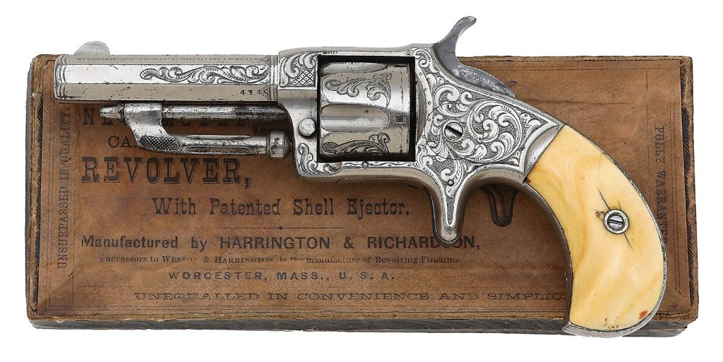 serial #4143, 32 RF, 2 3/4'' octagon barrel with an oxidized bore showing evident rifling. This attractive revolver shows lovely period New York engraving with nice flowing foliate scrollwork, light crosshatching along breech flats and geometric motifs along barrel. There is a floral design behind the hammer and the right side of the frame shows a very nice wide foliate riband, a space suitable for a monogram but it remains vacant. The metal surfaces retain about 85% original nickel finish with scattered light flaking to gray-brown patina and some old dings here and there. The barrel address and patent dates remain strong and the hammer shows some smoky gray wisps of case-hardening. The revolver wears a set of nice smooth antique ivory grips that remain in fine condition with some scattered light dings and scuffs. The grips have taken on a fine patina and show a few honest age checks and nice grain. The half cock notch is worn and the hammer spring rather weak though the action is functional at full cock with timing a bit off. The revolver includes an original box though the lid may be mismatched from the base and there is some expected edge wear and torn corners. The lid label is in fine condition and the end label of the base calls out a ''No. 1 NICKELED'' though a ''2'' is also written beside it in antique ink and the base shows a rather long faded scrawl of pencil markings. The interior instruction label is also intact. A nice example not often seen engraved. (13B11777-67) {ANTIQUE} [The Richard Littlefield H&R Collection] (1500/2000)