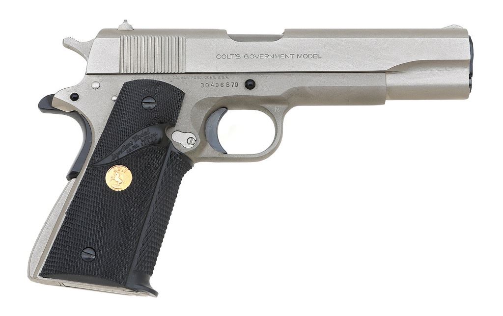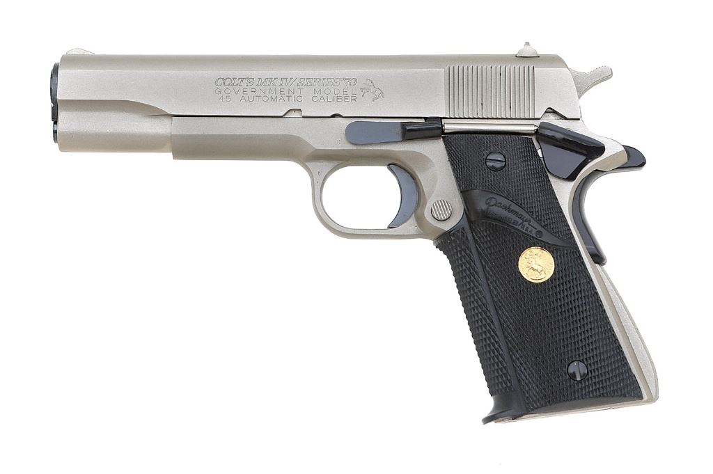 serial #30496B70, 45 ACP, 5'' barrel with a bright excellent bore. This lovely MK IV / Series '70 pistol is as-new-in-box and retains 99% of a seldom seen original satin nickel finish. The small parts have a rich blue that nicely offsets the nickel and remain in excellent condition. The checkered rubber Pachmayr wraparound grips feature gold Rampant Colt medallions and rate excellent. This gun has typical Government Model features and a Series '70 collet bushing. It includes the original factory woodgrain box with Styrofoam insert that is correctly end labeled and numbered to the gun, satin nickel finished factory marked seven-round magazine, manual, and paperwork. The box rates fair showing light storage wear, it is missing several dust flaps and the label flap is torn. A wonderful opportunity to round out your collection with this beautiful 1980 gun. (8B11770-10) {MODERN} (2200/2800)