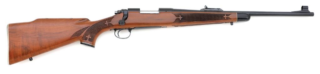 serial #29778, 222 Rem, 20'' barrel with a bright excellent bore. The metal surfaces of this 1962-manufactured rifle retain 97% original blue with scattered specks of fine oxidation staining, light handling marks and high edge wear. The bolt remains mostly bright with some tiny specks of oxidation scattered about. The fleur-de-lis checkered pistolgrip Monte Carlo hardwood stock with left side cheek-piece, ebony tip and gripcap rates about excellent with some minor handling marks and spots of loss in the clear coat form a contaminate that are relatively unobtrusive. The rifle is sighted with a hooded ramp front sight and adjustable sporting rear sight. The receiver has been drilled and tapped for bases and included with the rifle are a factory box end labeled and numbered to the gun with original hangtag, one-piece Buhler base, sling, related papers, and QD rings. A nicely configured rifle in a popular chambering that appears to have seen little use over the years. (10A11742-3) {C&R} (1500/2000)