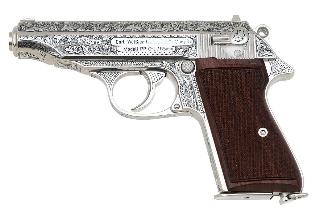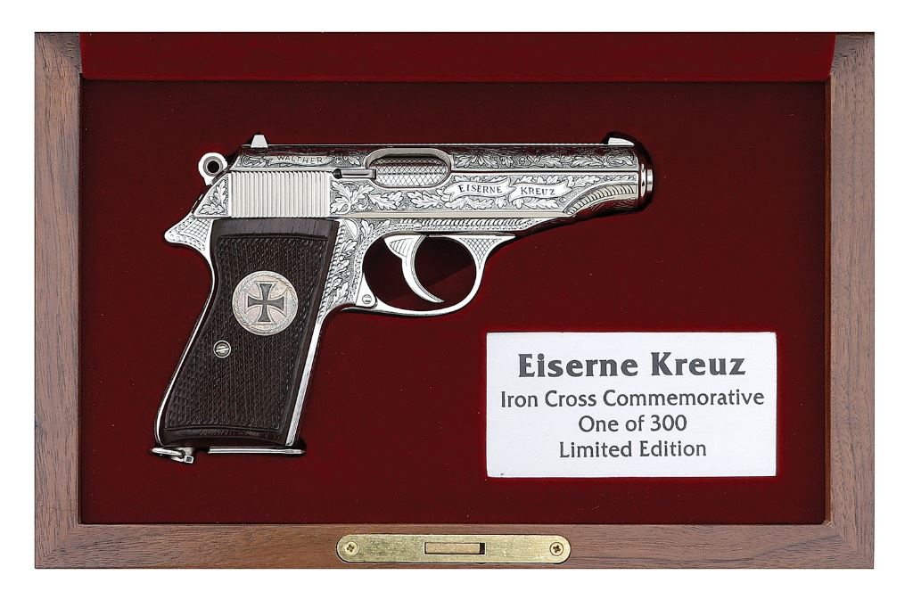 serial #466385 / IC031, 32 ACP, 3 7/8'' barrel with a bright excellent bore. Built around a West German-made Walther PP pistol, this is actually a very attractive and desirable commemorative pistol featuring fine quality flowing Germanic oak leaf and acorn motifs, fine punch-dot shading, bordering and areas of nice crosshatching. The left side of the slide bears the original Walther markings while ''WALTHER'' is in riband along the right-side rear of slide and ''EISERNE KREUZ'' is in riband along the forward section. The metal surfaces retain about 99% bright nickel finish showing just a couple of sparsely scattered tiny handling marks. The pistol wears a nice set of checkered rosewood grips in excellent condition, the right panel with an inlaid silver disc engraved with the eponymous Iron Cross. The pistol is equipped with a factory lanyard ring and one original blue-bodied and nickel-plated flush base magazine is included. The pistol includes a fine glass-paneled wooden presentation case with Walther banner etched on lid, maroon velvet lining and Eiserne Kreuz commemorative plate with ''One of 300'' callout. A key is also included. A lovely Walther PP with fine Germanic embellishments. (13B11712-2) {MODERN} (3000/4000)