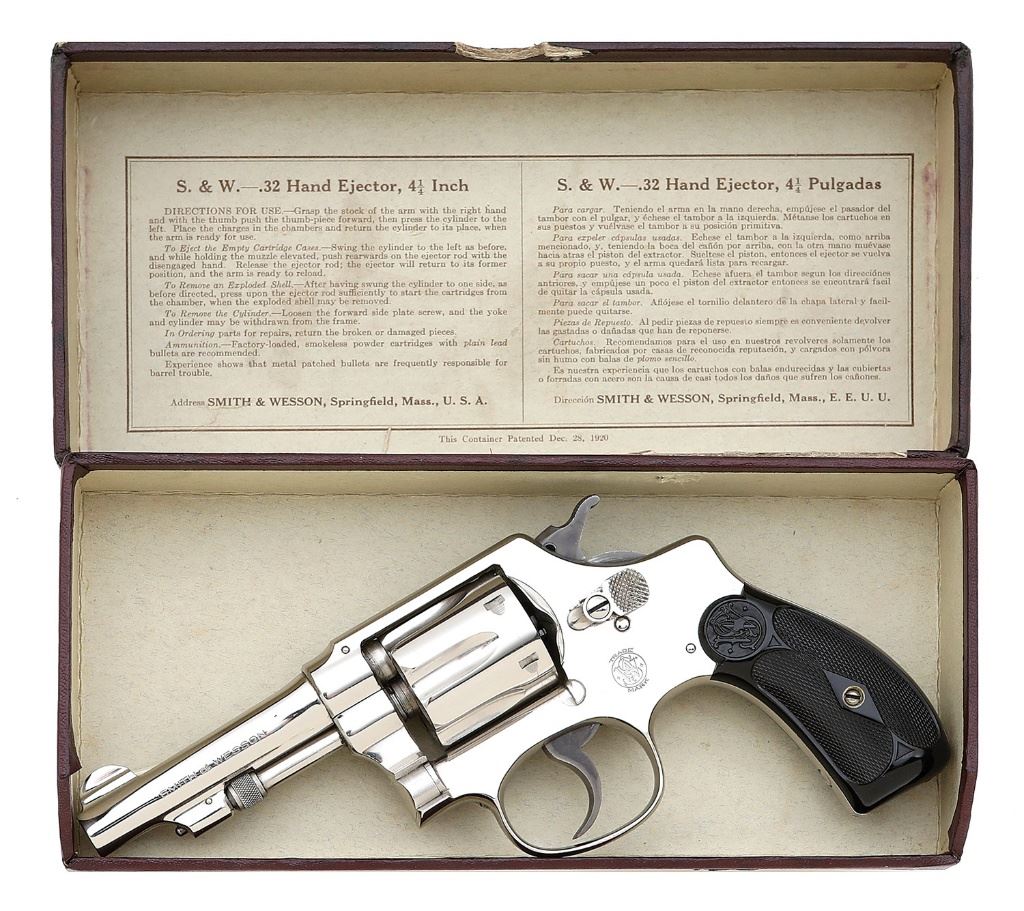 serial #511869, 32 S&W Long, 3 1/4'' barrel with an excellent bore. This fine revolver appears as-new-in-box and remains in wonderful condition. It retains about 99% original nickel finish with a light turn ring. The diamond checkered hard rubber factory grips feature S&W monograms, are numbered to the gun, and remain in excellent condition. This gun features fixed sights, five-screw frame, and all appropriate parts are correctly numbered to the gun. It includes a beautiful maroon cloth covered factory hinged box that is end labeled to the gun although any numbers or the bottom are no longer visible. These fine little guns are seldom seen in such fine condition and a great find for the collector. (8B10826-670) {C&R} [Dr. W. Lloyd Hudson, Jr. Collection] (1000/1500)