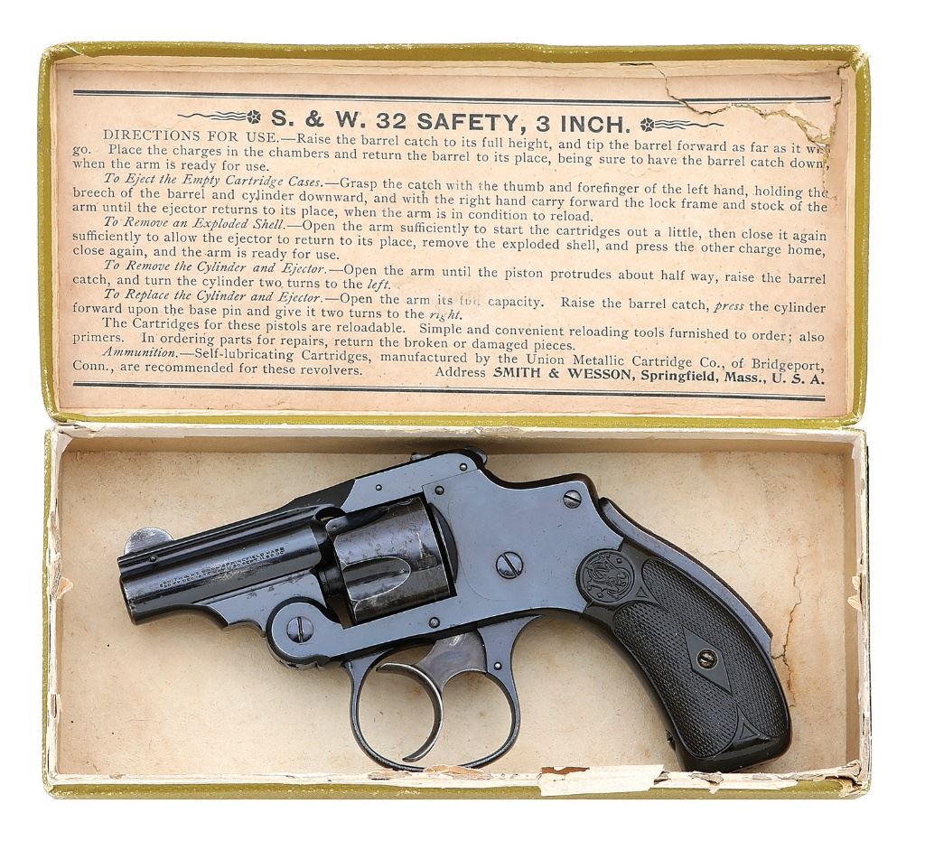 serial #88040, 32 S&W, scarce 2'' barrel with a bright very good bore showing a few moderate pits towards the breech with strong rifling throughout. The metal surfaces of this Third Model retain 90% original blue, showing scattered handling marks and high edge wear throughout, with the cylinder and grip safety toning largely to brown under direct light and oxidation staining in the areas of loss. The trigger has toned to a handsome smoky gunmetal patina and the checkered hard rubber grips remain excellent, showing only a few minor handling marks and some mild panel-to-panel discoloration. Timing and lockup are sound, ejector function remains robust, and the grip safety functions as it should. Included is a period hinged green cardboard box for the 3'' counterpart to this revolver which remains excellent overall with minimal soiling or edge wear. A charming and mechanically tight 32 DA for the collector. (26A10826-654) {ANTIQUE} [Dr. W. Lloyd Hudson Jr. Collection] (1000/1500)