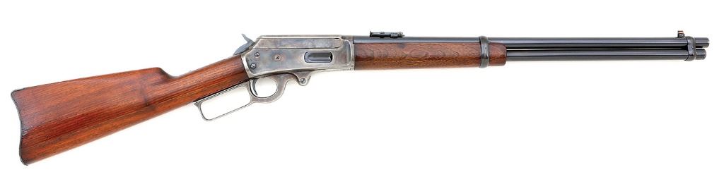 serial #A7691, 30-30 Win, 20'' Special Smokeless Steel barrel with a bright excellent bore. The barrel, magazine tube, barrel bands, loading gate and carbine-style buttplate retain 93-95% original blue show light freckling, minor handling marks, and spots of thinning to a pewter gray with high edge wear most noticeable at the buttplate. The action shows vibrant case-hardened colors with the lever more of a smoky gray with scattered tiny specks of fine oxidation staining. The saddle ring is no longer present and the standard carbine sights are intact. The smooth straight grip walnut stock and forend rate very good plus as lightly cleaned with a few minor handling marks visible under an added layer of finish. The action of this handsome carbine cycles smoothly and is in a very versatile chambering. (10A11536-1) {C&R} (1200/1800)