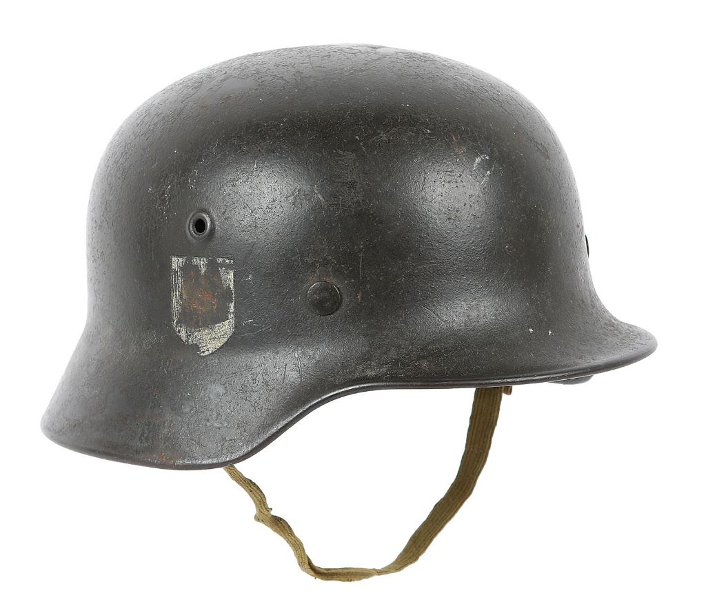 A rolled-rim steel helmet with embossed vent holes, field gray paint, and a worn white shield decal with remnants of SS runes on the right side. The decal is worn but enough detail remains to determine that the emblem is likely authentic. The paint finish is multilayered and features field gray on the surface with a brown ochre patina on the undersurface. The top of the dome is dented with a small hole and a 3'' hairline crack that extends toward the front. The interior face of the skirt is Quist marked ''Q66'' on the left side and ''334'' at the rear with the initials ''A.L.'' in white paint. The size 56 lining rates very good, showing age patina and scuffing at the rims but no fraying, cracking, separation, or loss. The original chinstrap has been lost to the years and in its place is a tan elastic strap. A distinctive SS artifact in fine condition. (28A11059-25) (1200/1800)